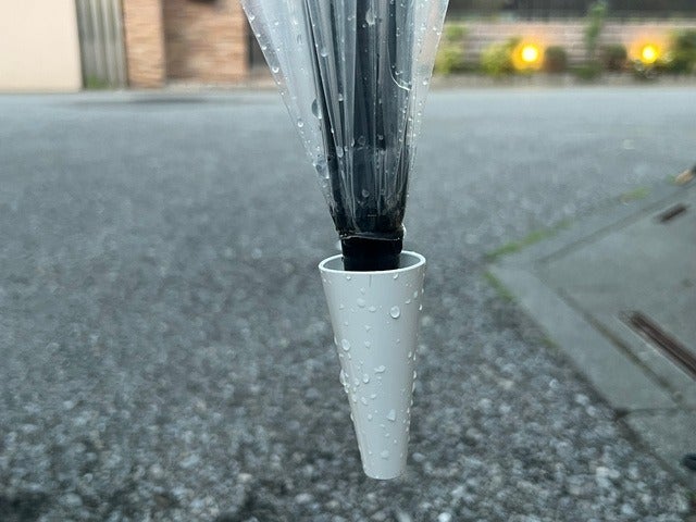 Casashの付属品「石突キャップ」を使用すると、ビニール傘の先端に水滴が溜まり、床に水滴が落ちることがなくなります。これにより足元が水滴で濡れる不快感から解放されます!