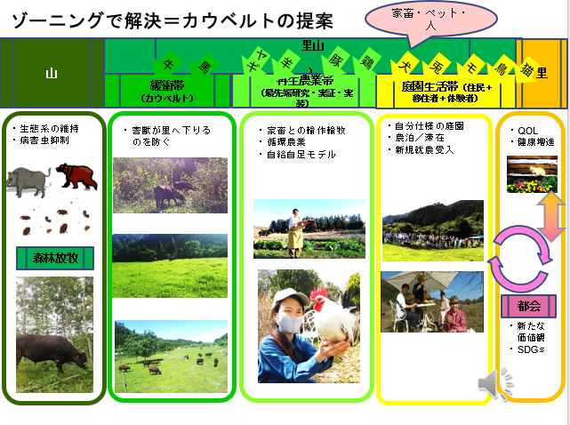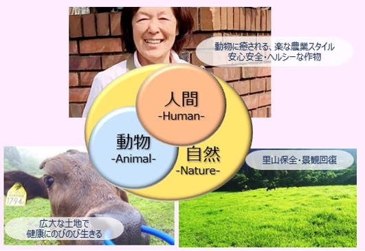 ※昔のようには人が膨大な時間と労力をかけて維持管理ができなくなった人口減少・過疎化に悩む里山を、動物の力と自然の循環の輪を生かして省力的に再生させ、発展させていくモデルです。