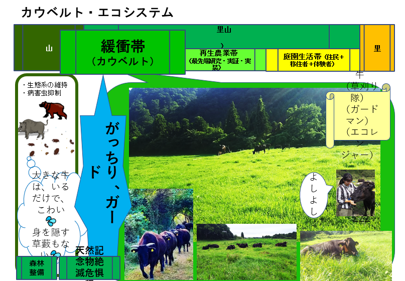 - ①カウベルトゾーン…人間と野生動物が自動的にすみ分けられる牛の大きさと習性を活用した帯状の緩衝地帯 災害時にも盤石な放牧地、動物たちの快適な避難先にもなります(炭素貯留の最前線)