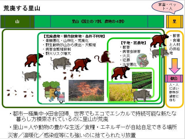 2024年現在、実はこの問題は、少子高齢化、後継者不足、都市への一極集中による地方の農村の過疎化、耕作放棄地、荒廃農地の急増、自治体消滅等の形で、実は全国津々浦々の里山で急増しています。獣害に脅かされるのは、里山から街へも広がっています。
