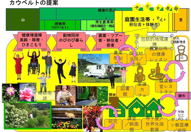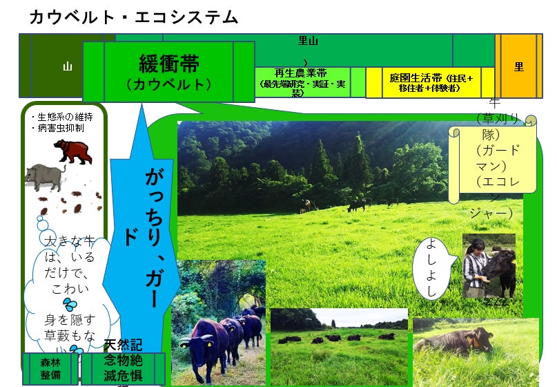 - 人と信頼関係が築け、人の意思を聞いてくれる牛(カウ)が、帯状(ベルト状)に住み、お腹一杯草を食べ、第2の人(牛)生を謳歌して活躍してもらえる地帯です