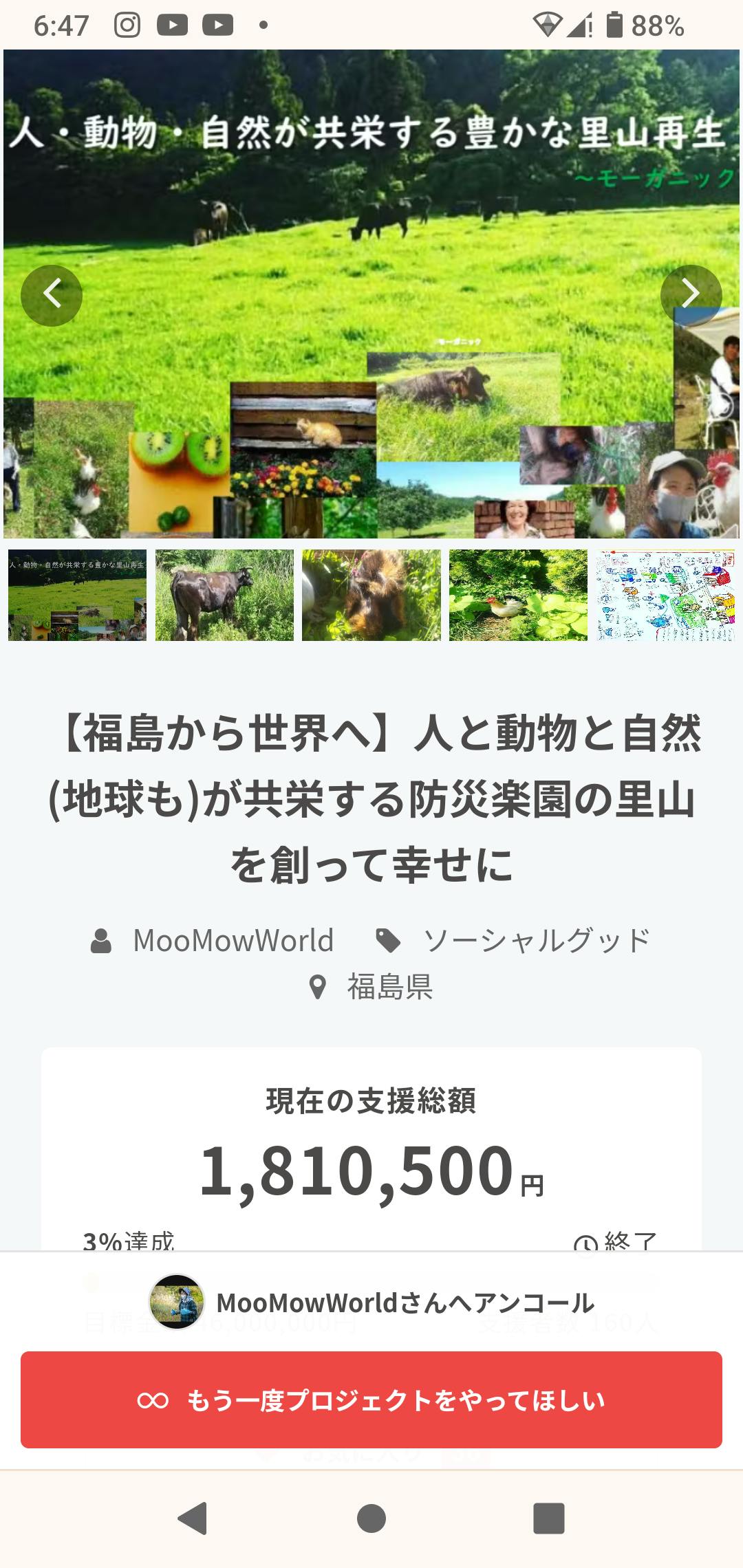 2024/06/13 12:08皆様のお陰で1810500円達成しました!!大切に使わせていただきます。早速ご報告させていただきます。【使途①ご報告】もーもーガーデンももーもーワールドも、動物共栄の里山は、動物たちが生き物ですので、また草も自然も時期がありますので、現在進行形で毎日進んでいるプロジェクトです。そのため、優先順位の高いものから、クラウドファンディングでのお約束通り、キャンプファイアーの来月末の振込日より、皆様からのご支援をしっかりどんどん必要なところに使わせてきていただいております。(前倒しで貸して下さった方、まことにありがとうございます)そのご報告をさせていただきます。(※時間節約のため、購入順や写真が撮れた順で、そこまでまとまってないですが、項目ごとの詳細になります。後日使いきった時にまとめて、優先順位順に金額を項目毎に整理したご報告をさせていただきます。)使途①のご説明です。写真のように草ロール作り作業費用です。(1)冬まで長期保存できるラップフィルム、爆値上がり中のため安い時期に前倒しで購入してました。(※前回の計算にラップ伸縮率が入ってなかったそうです!まことに申し訳ありません!2倍に伸びるので、1本1800mで前の計算の2倍のロールができることになります!節約のため去年は18巻き三重にしたら、穴が開いてしまったので、今年はやはり規定の24巻き四重にしたいと思います)(2)トラクター整備費用:エンジンオイル代、ギヤオイル代、グリース代、グリースガン代、潤滑油代(3)トラクター4台の燃料代(軽油)(4)作ったロールを運搬する軽トラの燃料代(ガソリン)(5)軽トラの整備費用:エンジンオイル代等(6)地元の方々雇用アルバイト代時給1000円~1200円+交通費。今年の冬用に、現在毎日晴れたら作っています。新たに地元の技術を持った方、農家の方々をアルバイトで雇用させていただいて、安全講習、技術講習してから一緒に作っております。(今まで作業してくれていた災害ボランティアの方々は、多発する全国の被災地や今年1月の石川県能登半島地震の被災地へ行かれております)日本で、近年の異常気象で、晴天が続く日は貴重になってきたので、雨が来る前にもーダッシュで作っております炎天下ですが、一所懸命作業してくれています(※6連モアや他の大型作業機を動かせる4油圧ホース付き80馬力四駆トラクター(中古で最安値でも380万円に値上がり中)は今回の達成額では買えませんが、刈り歯が付け根から取れてきた今の古い2連モアさんにもう少し頑張ってもらいたいと思います。毎回の高額な修理代削減と、作業時間を1/5に圧縮するために、このトラクターが空から降ってくるのは今後も熱烈に待ち続けております~)(7)軽トラ2台修理代草ロールを2個運べる軽トラが疲労したのか、最近は重かったり走るのが長いと10分くらいでよく止まり、ダマシダマシ使うのが限界に来てましたので、皆様からのご支援でこれから修理にも出させていただきます。昨年秋のトウモロコシ運搬で大活躍してた山内さん寄贈のサンバーも、オイル交換はしっかりしていたのですが、なぜか白い煙を吹き出したので、修理に出させていただきます。(8)軽トラ車検代一台は8月にあります山内さん寄贈のサンバーは、わざわざ車検通してからもってきてくださったので、来年7月まで大丈夫です【9】一気に10個の草ロールを運べて燃料人手時間を大幅に節約できる、また災害時に牛や他の動物、人の家シェルター、水、支援物資も運べる2トントラック(できればユニック付き)は中古で400万円越えていて今回は買えませんが、いつでもほしいので、いつでも受け付けております~(笑)といっても、オールイン形式で集まったこの金額の中で収益化して、早く中古のこのトラック買いたいと思います!!!皆様、どうもありがとうございます詳しくはFacebookをご覧下さいhttps://camp-fire.jp/projects/view/661615 もっと見る