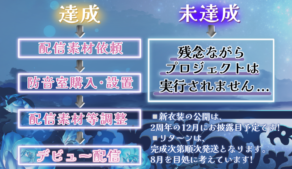 ※ もし万が一、防音室購入が難くなった場合でも、防音賃貸を借りるなどして頂いた支援は "全額" 環境設備、もしくは配信設備(オープニング動画や配信背景等)、