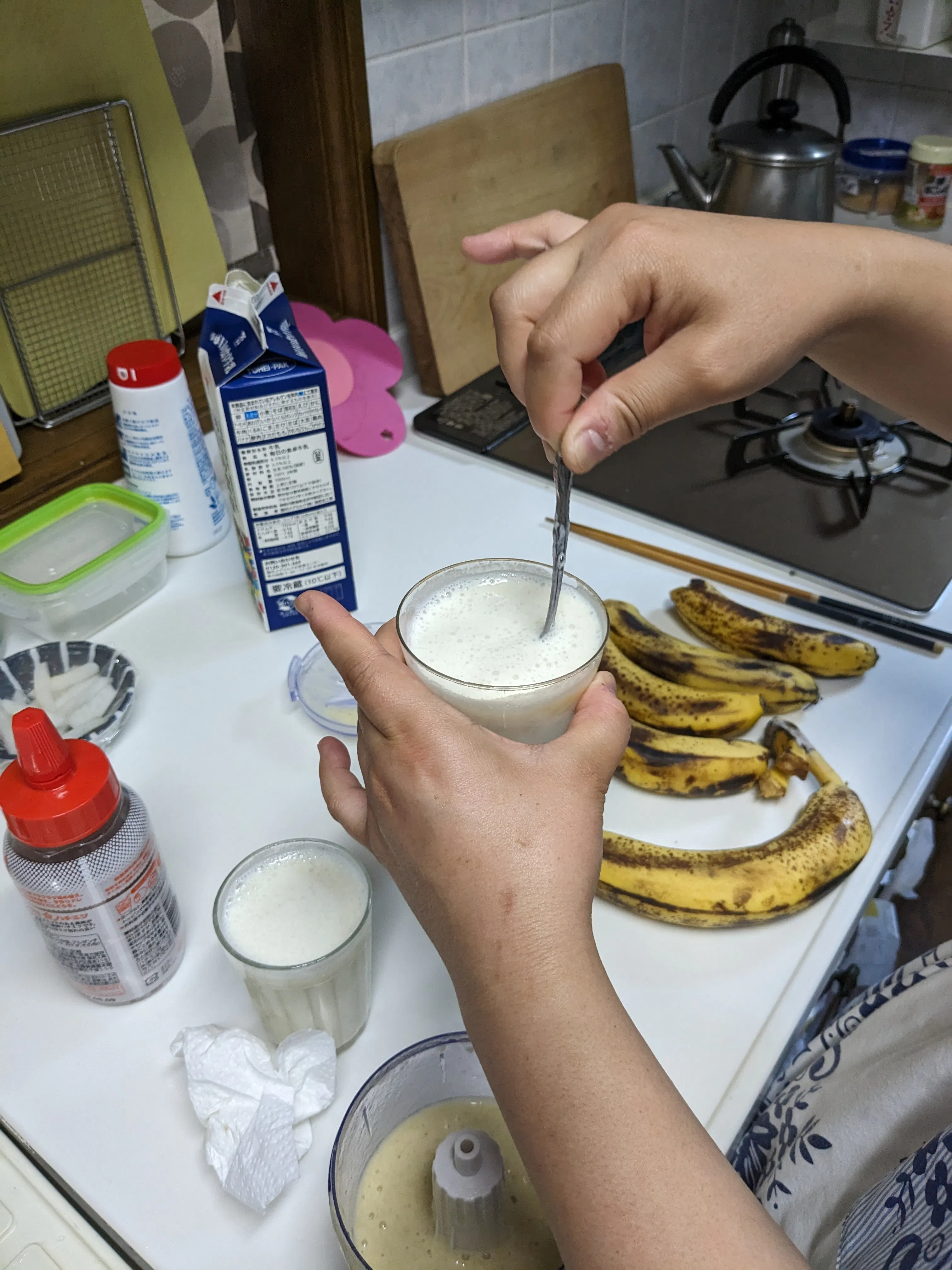 今日の写真は、先ほど寄付でいただいた完熟のバナナでバナナジュースをつくっているところです。