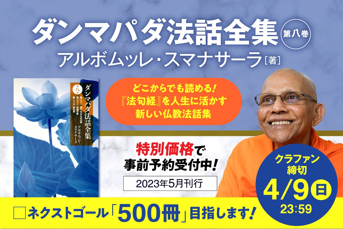 仏教書の出版に期待してくださる皆さんのご協力によって再生したサンガ新社から、アルボムッレ・スマナサーラ長老の『ダンマパダ法話全集 第八巻』を刊行できることになりました。この大切な書籍の刊行に取り組ませていただき、本当にありがとうございます。