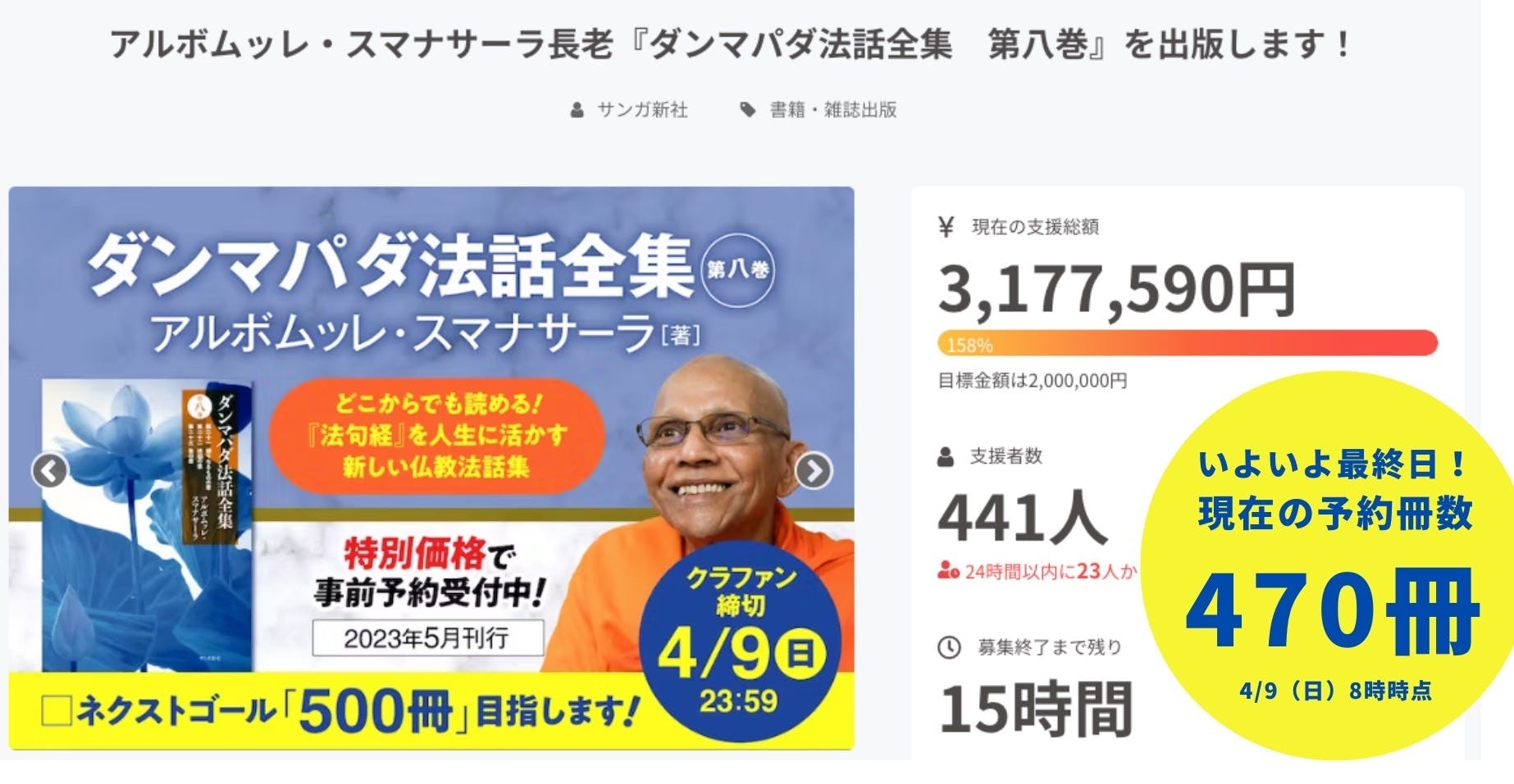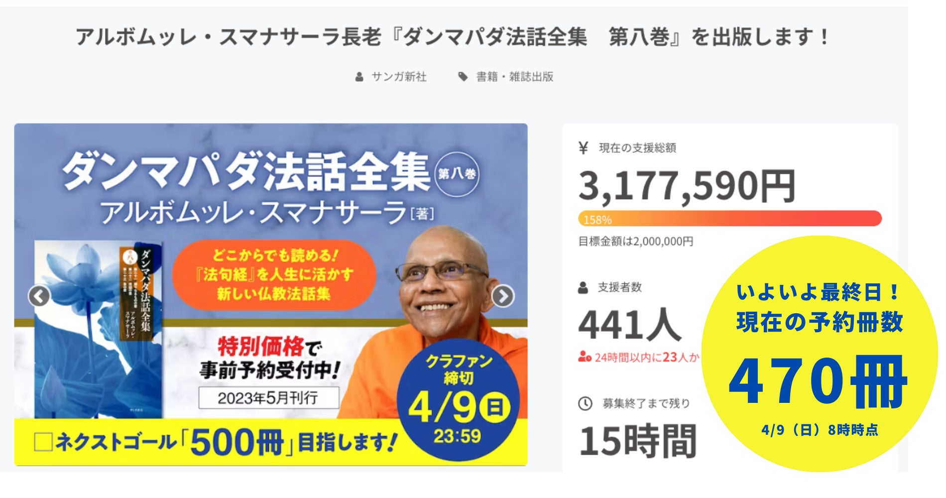 2023年3月11日(土)午前7時にスタートした「アルボムッレ・スマナサーラ長老『ダンマパダ法話全集 第八巻』を出版します!」クラウドファンディングは、目標金額200万円を突破し、現在、ネクストゴールとして「事前予約冊数500冊」を目指しています。