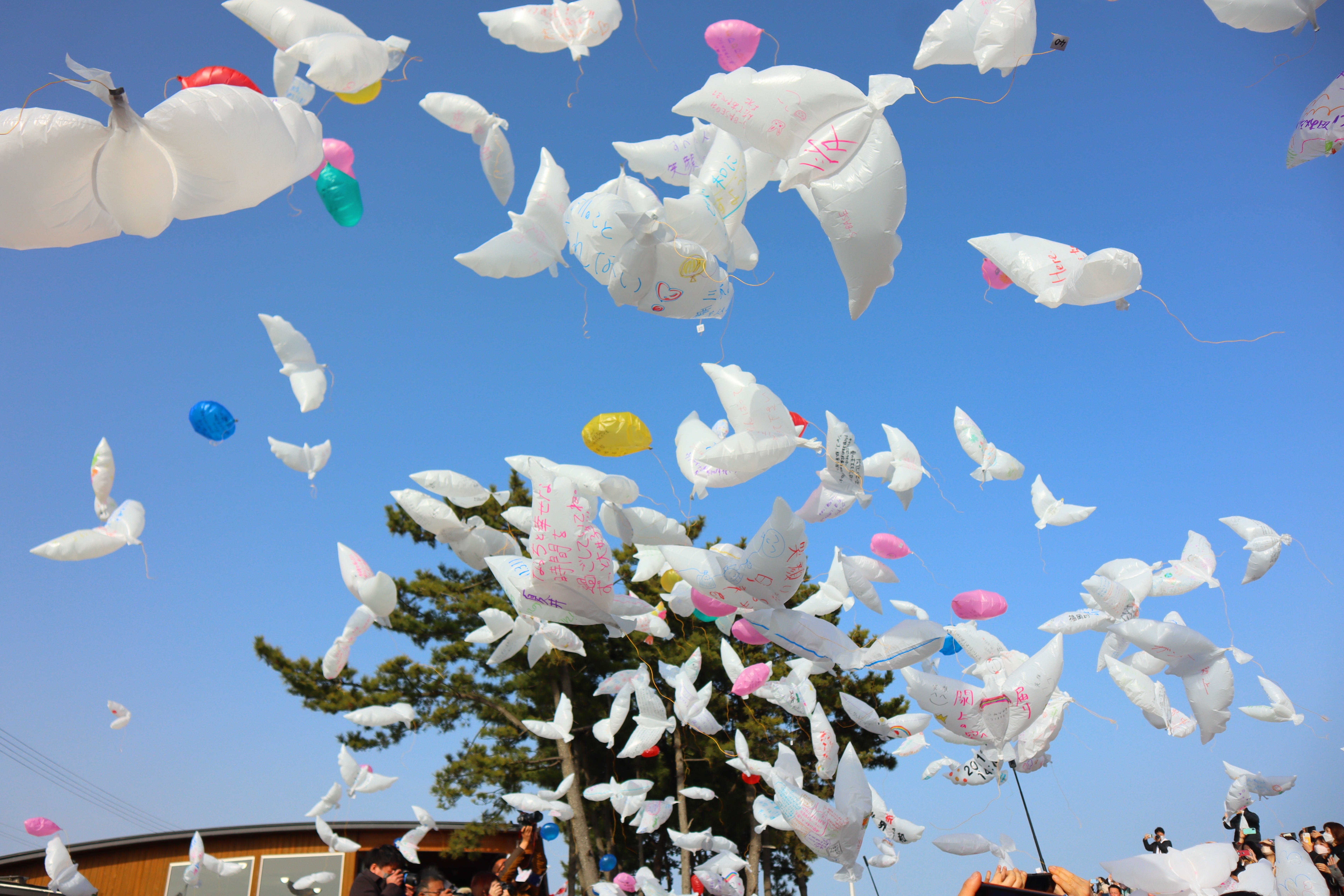 14時46分。震災で亡くなられた方々へ黙とうを捧げるともに、生きとし生けるものの幸せと世界の平和への想いを込めて、ハト型エコ風船にメッセージを託し、大空に放ちます。