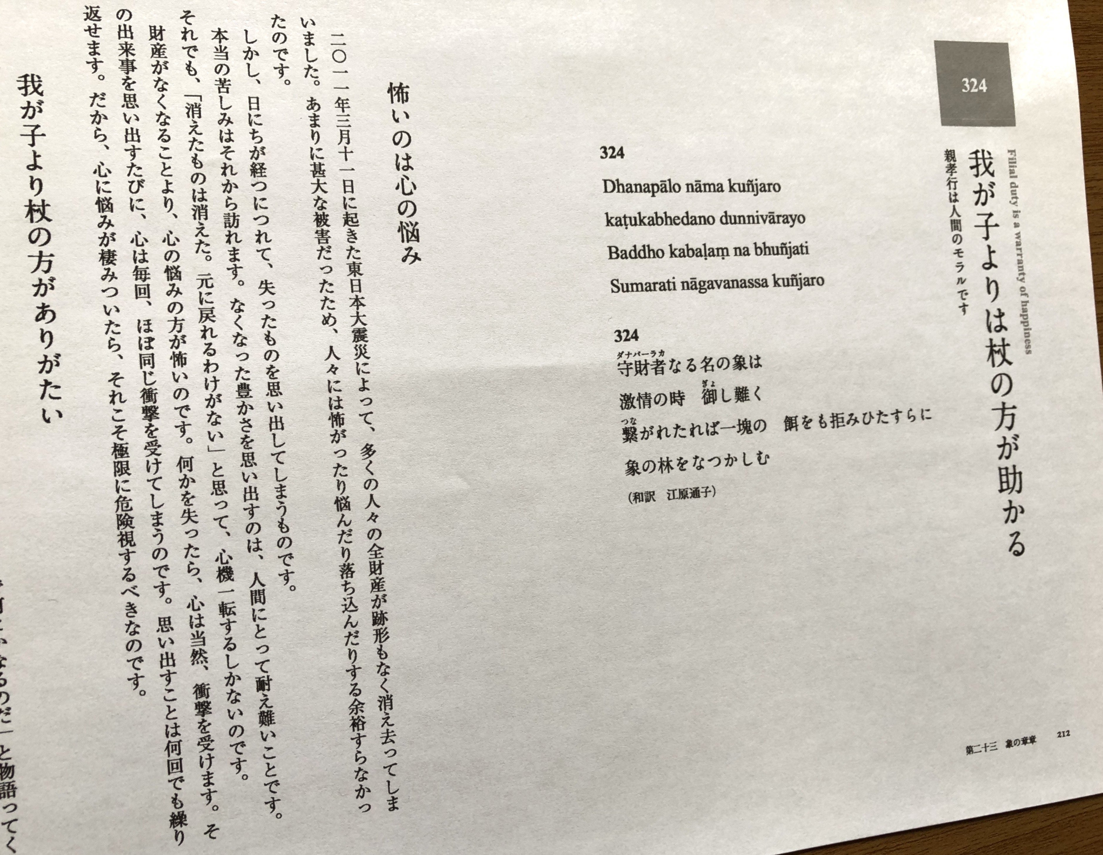 特に、324偈の解説「我が子よりは杖の方が助かる」は東日本大震災発生直後にご執筆されましたので、スマナサーラ長老は経典解説の中で、震災の困難な状況にも言及されています。