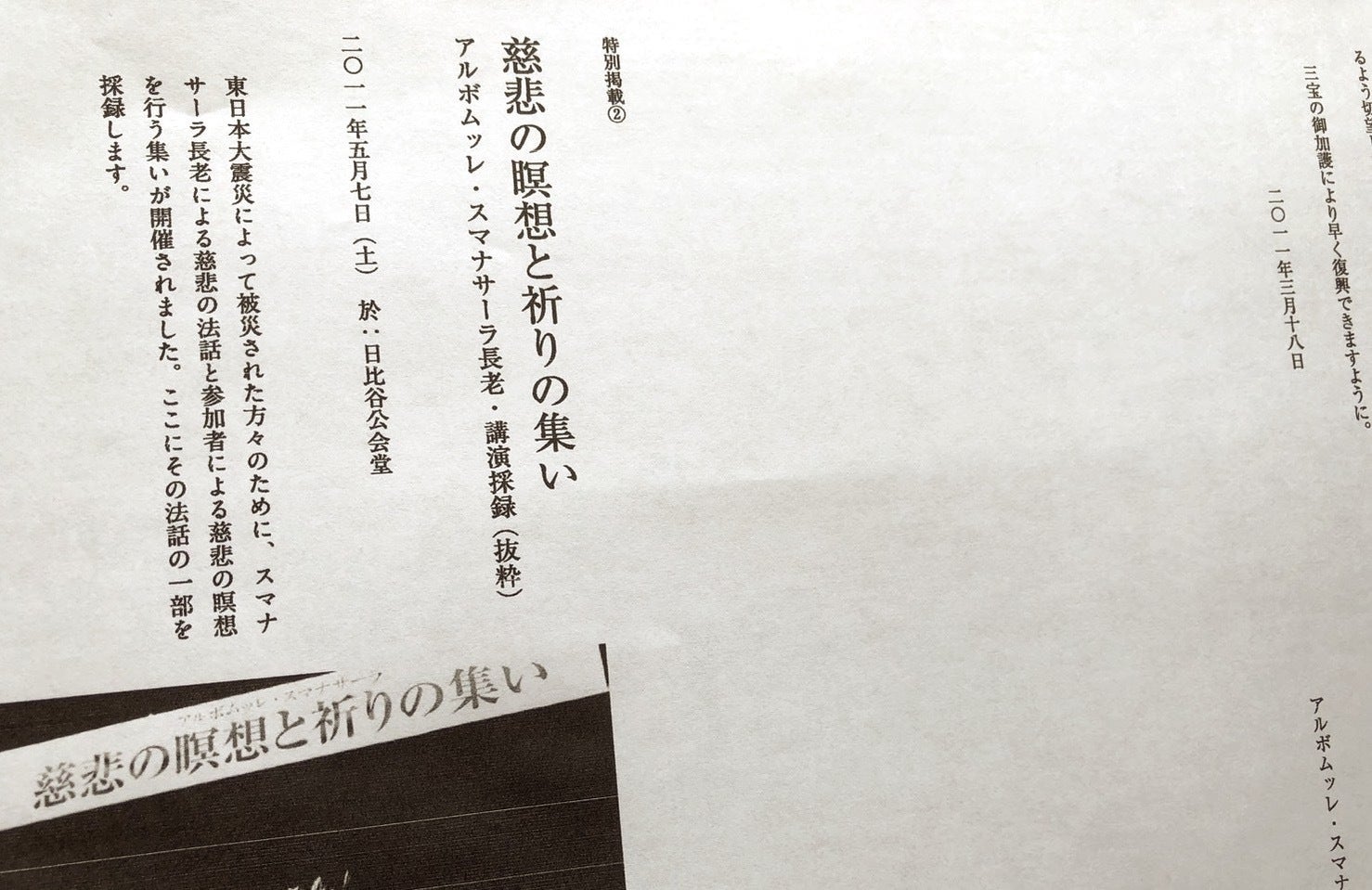 また、2011年年5月7日には、東京都千代田区の日比谷公会堂にて、「慈悲の瞑想と祈りの集い」を開催し、法話と慈悲の瞑想を行いました。