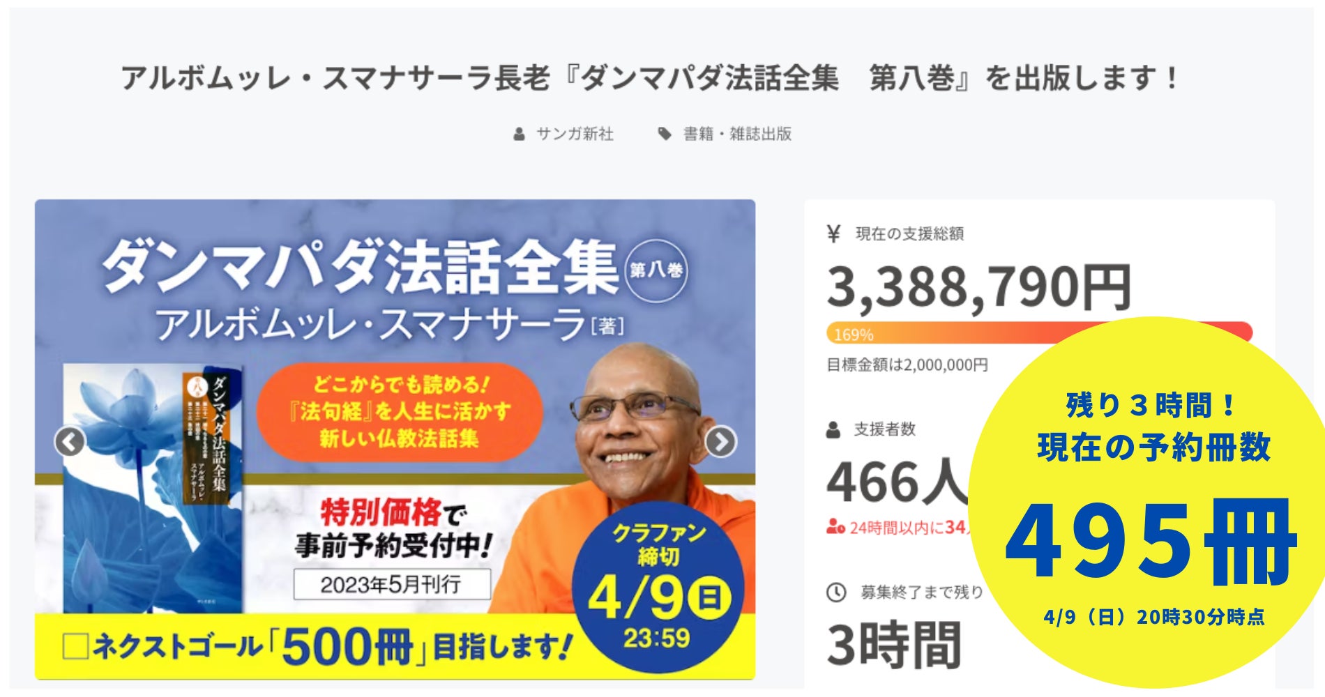 「アルボムッレ・スマナサーラ長老『ダンマパダ法話全集 第八巻』を出版します!」クラウドファンディングは、目標金額200万円を突破し、現在、「ネクストゴールとして「事前予約冊数500冊」を目指しています。