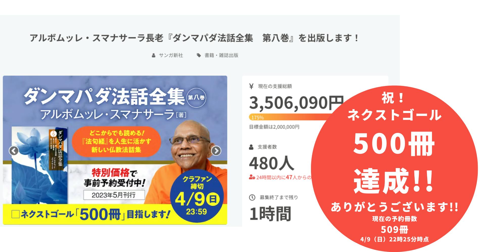 「アルボムッレ・スマナサーラ長老『ダンマパダ法話全集 第八巻』を出版します!」クラウドファンディングは、目標金額200万円を突破しながらも、さらに多くの方々に仏法に広げていきたいという想いから、ネクストゴールとして「事前予約冊数500冊」を目指して活動を続けてきました。
