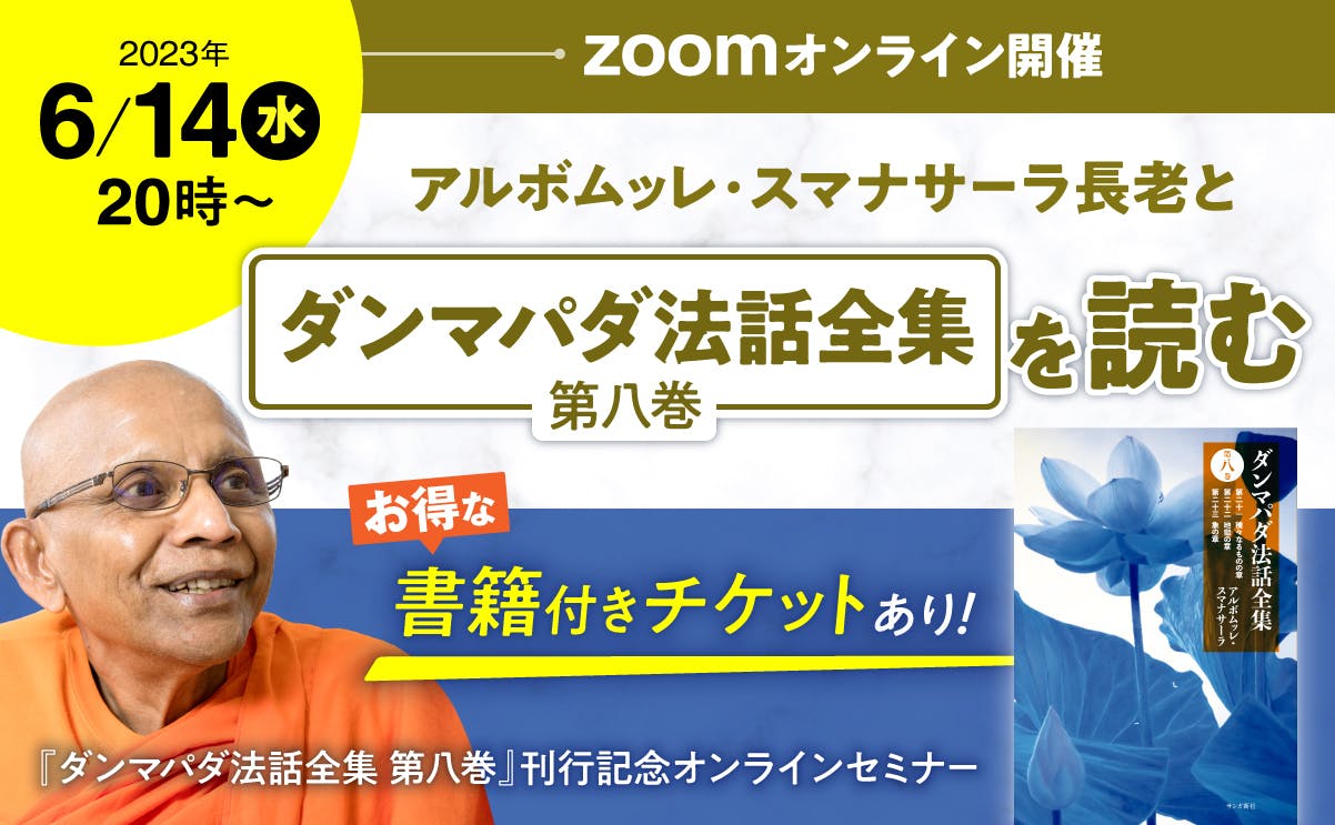 そしてこのたび、刊行記念オンラインセミナー「アルボムッレ・スマナサーラ長老と『ダンマパダ法話全集 第八巻』を読む」の一般発売をスタートいたしました。