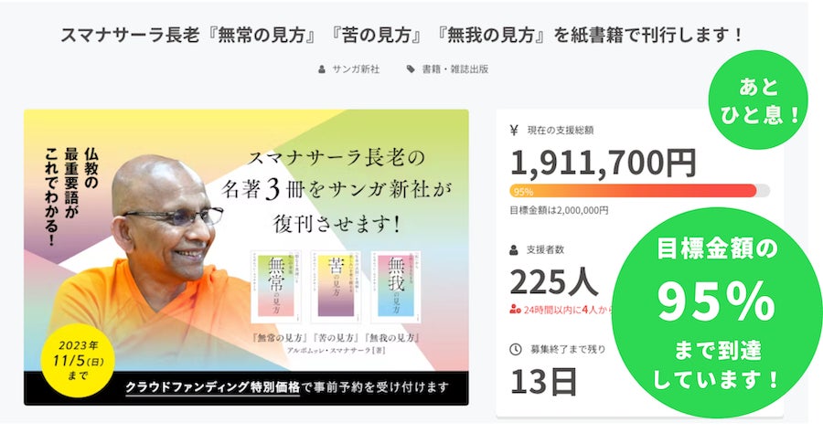 「スマナサーラ長老『無常の見方』『苦の見方』『無我の見方』を紙書籍で刊行します!」のクラウドファンディングも「残り13日」となりました。そして、目標金額200万円達成まで、あとひと息です。