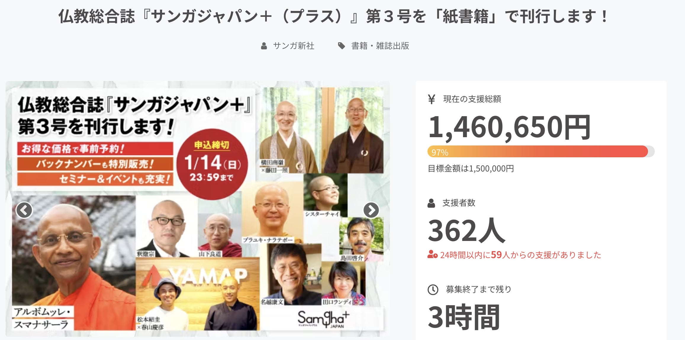 2024年2月に刊行する仏教総合誌『サンガジャパン+ Vol.3』は、「1月14日(日)23:59」までクラウドファンディングで事前予約を受け付けています。