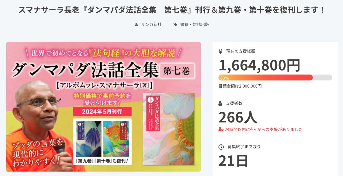 目標金額200万円を掲げて実施しております「スマナサーラ長老『ダンマパダ法話全集 第七巻』刊行&第九巻・第十巻を復刊します!」クラウドファンディングは、3月10日(日)20時時点で、支援総額は166万円を超え、目標金額の83%に到達しています。
