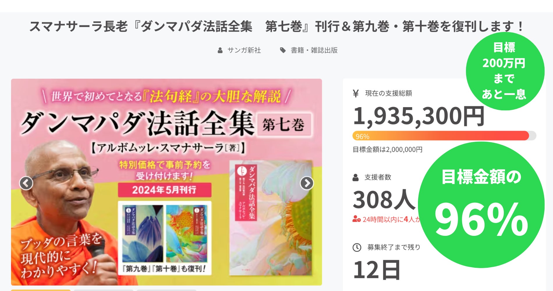 2月23日にスタートしました、「スマナサーラ長老『ダンマパダ法話全集 第七巻』刊行&第九巻・第十巻を復刊します!」クラウドファンディングは、3月19日(火)20時時点で、支援者数が308人となりました。