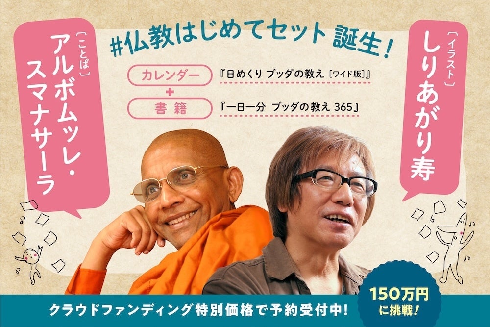 大ベストセラー『怒らないこと』でお馴染みの初期仏教僧侶アルボムッレ・スマナサーラ長老のカレンダー『日めくり ブッダの教え[ワイド版]』(イラストは漫画家のしりあがり寿さん)と、仏教のエッセンスを365の法話に凝縮した書籍『一日一分 ブッダの教え 365』をセットでお届けするクラウドファンディングは、支援金額100万円を超え、支援者数も110人となりました。