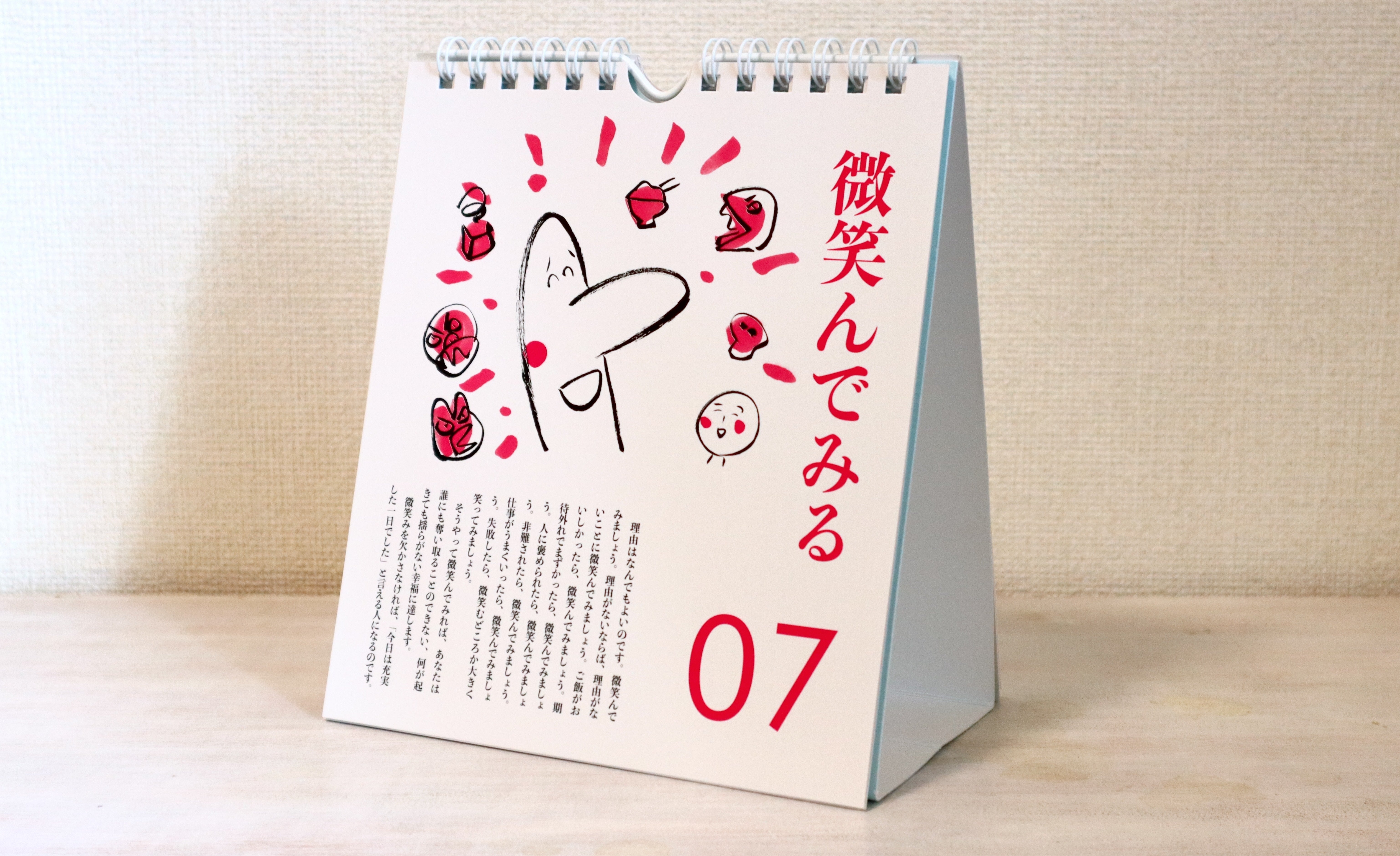 「日めくりカレンダー」は、いつも「微笑んでみる」のページを開いて飾っています。これで、日常生活で起こるたいていのことは乗り越えられるように思います。
