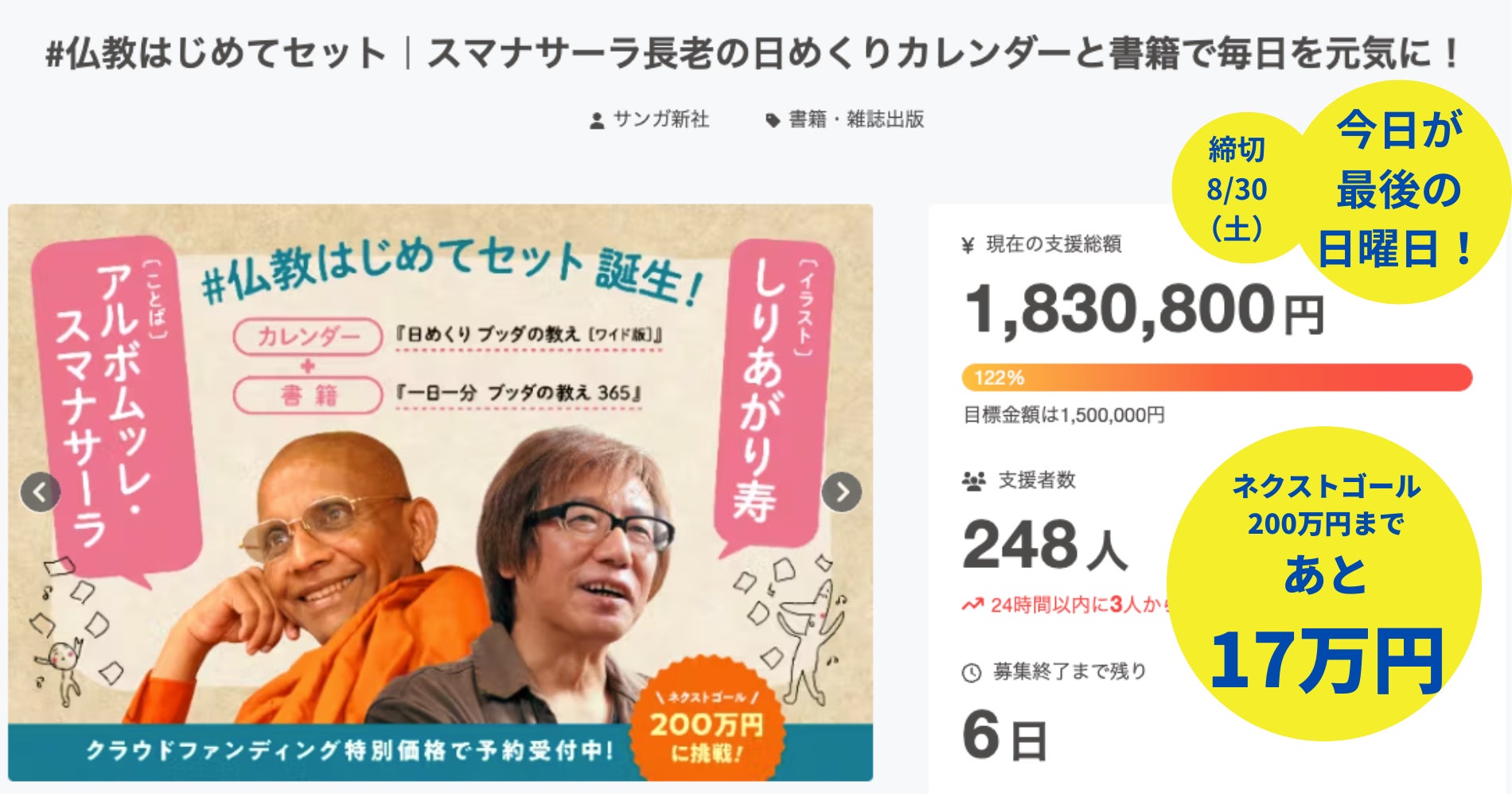 7月20日(土)にスタートしました、「#仏教はじめてセット|スマナサーラ長老の日めくりカレンダーと書籍で毎日を元気に!」クラウドファンディングは、目標金額150万円を突破し、現在、ネクストゴール200万円を目指して活動しています!