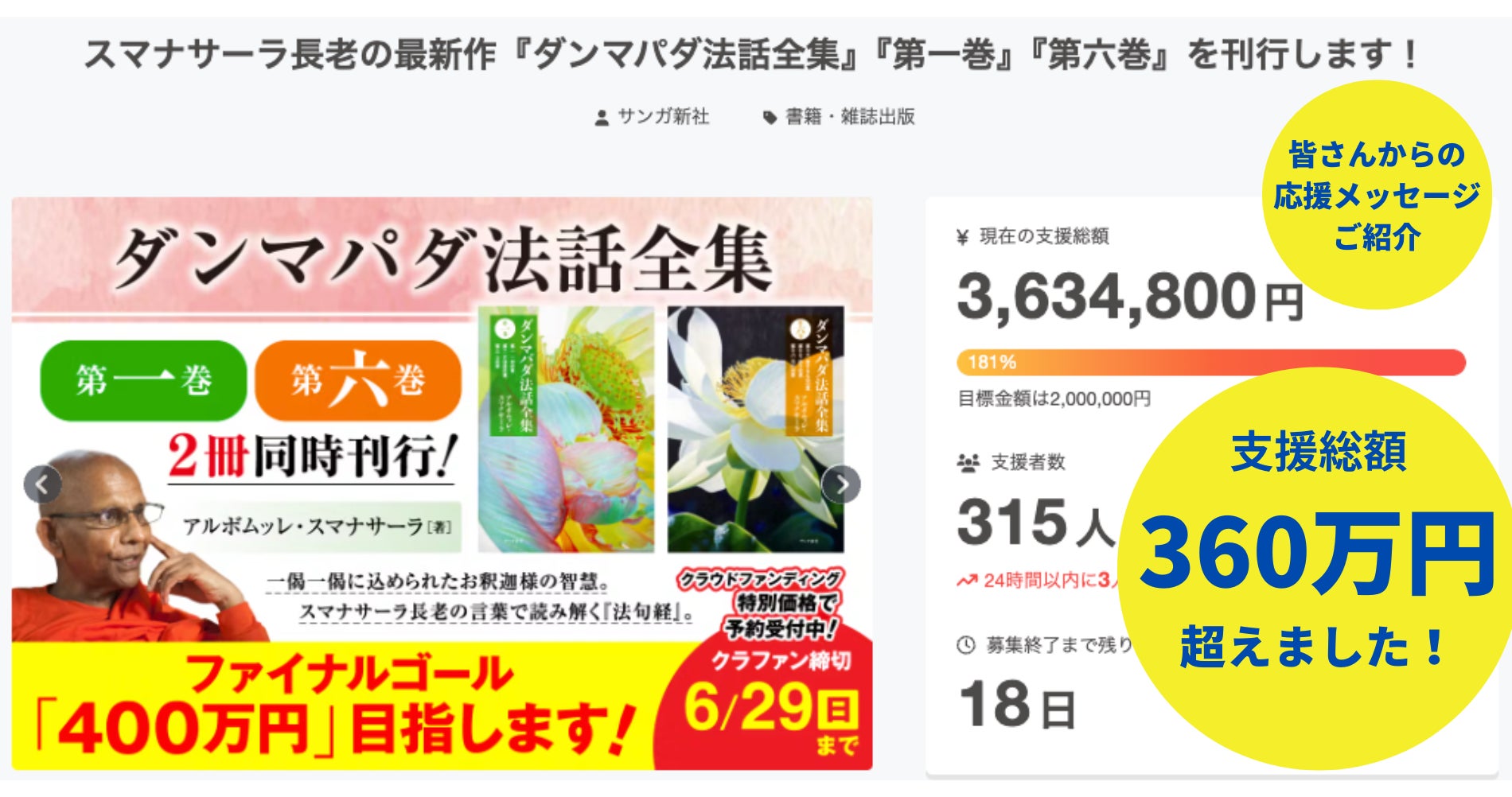 スマナサーラ長老の最新刊『ダンマパダ法話全集』『第一巻』『第六巻』の刊行を目指す本クラウドファンディングは、6月11日現在で、363万円・315人ものご支援を頂戴しております。