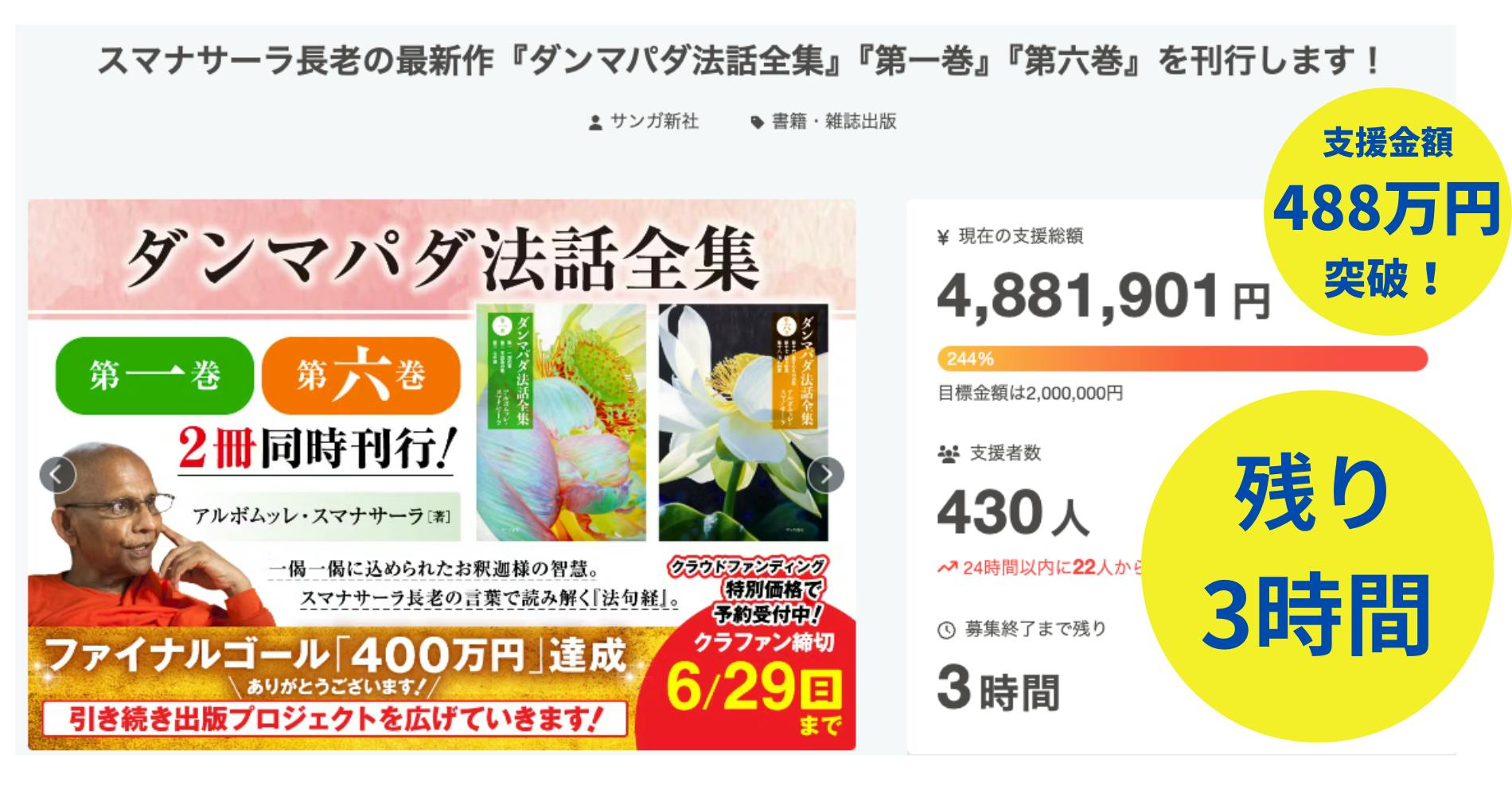 「スマナサーラ長老の最新作『ダンマパダ法話全集』『第一巻』『第六巻』を刊行します!」クラウドファンディングは、当初の目標200万円を達成後、ネクストゴール300万円、さらにファイナルゴールの400万円も突破し、現在、最後のご支援のお願いをしています。