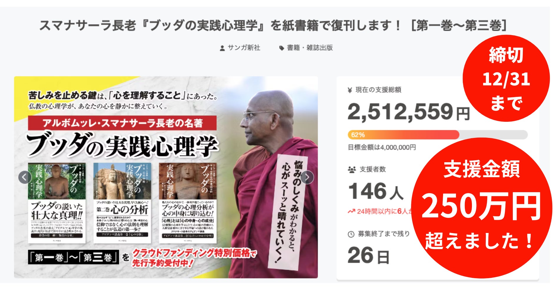 11月22日にスタートしたアルボムッレ・スマナサーラ長老『ブッダの実践心理学』復刊クラウドファンディングは、支援総額が250万円を突破いたしました!
