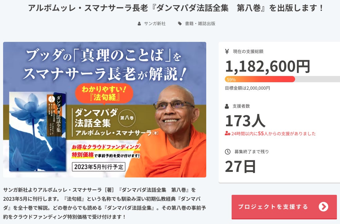 スタートから3日、たくさんのご支援を誠にありがとうございます!サンガ新社の佐藤由樹です。今回は『ダンマパダ法話全集 第八巻』への応援を誠にありがとうございます。3月11日(土)午前7時にスタートした「アルボムッレ・スマナサーラ長老『ダンマパダ法話全集 第八巻』を出版します!」クラウドファンディングに、初日から本当にたくさんのご支援をいただき、とても嬉しく驚いております。2日目となる12日(日)には、早くも目標金額の50%となる「支援金額100万円」を突破することができました。そして3日目となる本日13日(月)は、13時時点で118万円となり、ご支援人数も170人を超えています。スマナサーラ長老の全集の刊行へ向けた、みなさんからの力強いご支援にあらためて深くお礼申し上げます。『ダンマパダ法話全集』全十巻完結に向けた再スタートです今回の『ダンマパダ法話全集 第八巻』はサンガ時代に刊行した「第十巻」「第九巻」に続く、待望の「第八巻」です。クラウドファンディングのページでもお伝えしておりますが、『ダンマパダ法話全集』全十巻は、最終巻から遡るかたちで刊行する計画となっており、第十巻と第九巻は株式会社サンガから刊行されました。しかし、2021年1月の株式会社サンガの事業停止により、以降の刊行が止まってしまいました。私にとっても、旧サンガ時代の最後の刊行書籍が『ダンマパダ法話全集 第九巻』でしたので、その続刊となる『ダンマパダ法話全集 第八巻』の刊行は、サンガが新しく生まれ変わるため一つの大きな目標でもありました。ですから、やっとこうしてクラウドファンディングでの事前予約を受け付けができていることを、心から嬉しく思っています。『ダンマパダ法話全集 第八巻』アルボムッレ・スマナサーラ[著]/サンガ新社[刊]どの巻からでも、少しずつでも読める、スマナサーラ長老の法話集です『ダンマパダ法話全集』は「全10巻の法話全集」と聞くと壮大な書物にも感じるかもしれません。でも実際は、スマナサーラ長老による偈の一つ一つの解説ごとに、一つの完結したテキストとしてお釈迦様の教えがまとまっています。その解説もとてもわかりやすいので、「手軽によむことのできる短い法話集」としても身近に置いていただけます。ですから、「第八巻」だけを読んでいただくこともできますし、もちろん「第九巻」「第十巻」もセットでお求めいただければ、広大なお釈迦様の智慧の世界をさらに感じることもできると思います。『ダンマパダ法話全集 第十巻』 『ダンマパダ法話全集 第九巻』アルボムッレ・スマナサーラ[著]/サンガ[刊]サンガ新社では、今回の第八巻の刊行から再スタートし、そして未来の全十巻完結に向けて、みなさんからのご期待に応えて出版事業を継続できるよう力を注いでまいります。引き続き応援をよろしくお願いいたします。