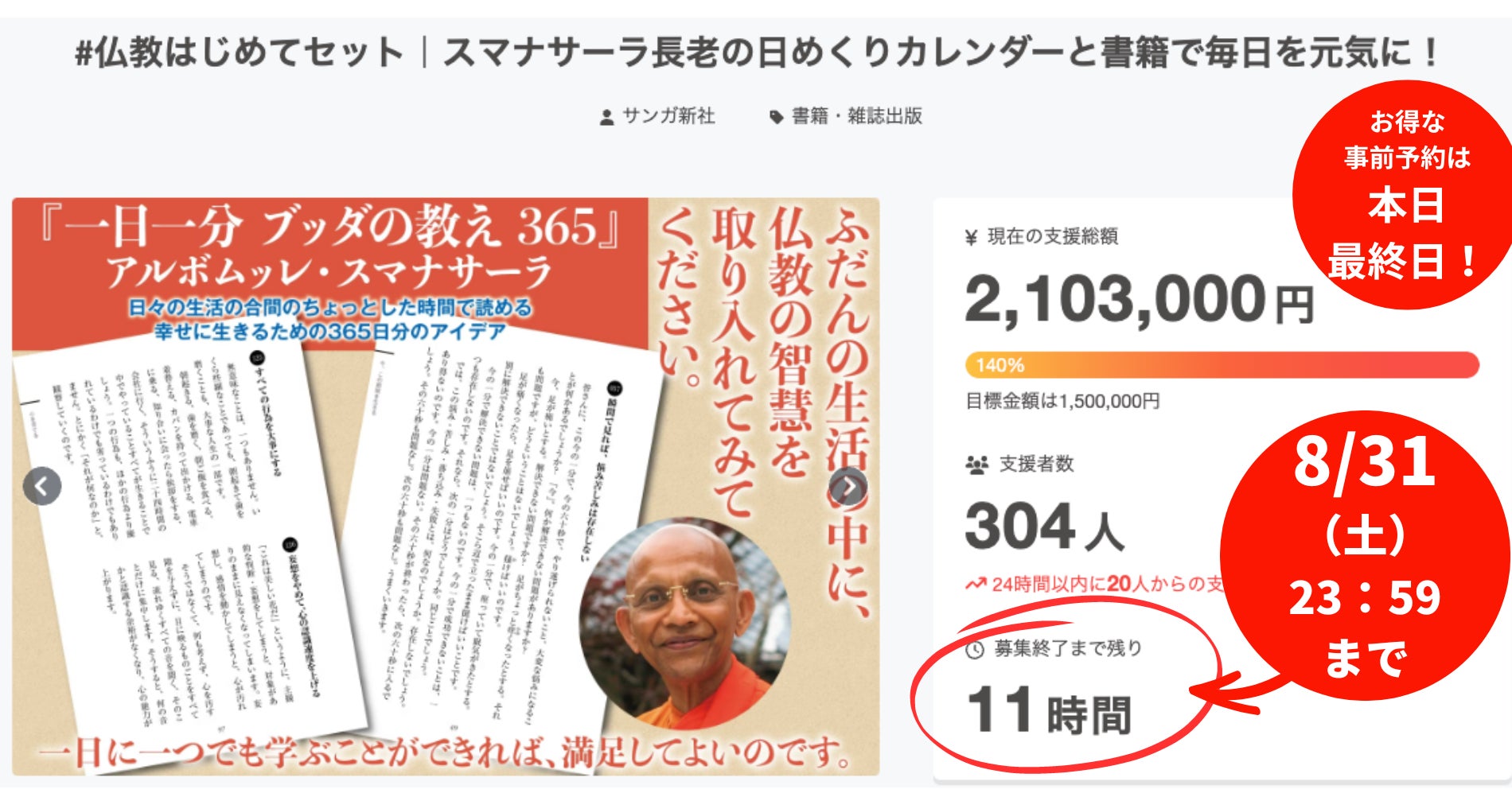サンガ新社のクラウドファンディングをご支援くださった皆様へいつもサンガ新社の活動を支えていただき、ありがとうございます!今回は新しいクラウドファンディングのお知らせをさせていただきます。★アルボムッレ・スマナサーラ長老80歳(傘寿)を記念して2冊の書籍を刊行します!!⇒ https://camp-fire.jp/projects/819266/view 開始8時間で目標金額の20%を突破しました!クラウドファンディング「アルボムッレ・スマナサーラ長老80歳(傘寿)を記念して2冊の書籍を刊行します!」を、12月28日(土)午前7時にスタートしました!アルボムッレ・スマナサーラ長老が満80歳を迎えられることを記念し、語り下ろしによる初の自伝と、写真や資料で活動を振り返る豪華写真資料集を刊行します。開始直後から続々とお申し込みをいただいており、開始8時間で早くも目標金額の20%となる「支援金額40万円」を突破することができました!皆さんの力強い応援を、本当にありがとうございます!80歳(傘寿)を記念した大プロジェクト今回のクラウドファンディングは、皆様のご協力をいただきながら、サンガ新社が満を持して実施する大プロジェクトです。私たちは、前身である株式会社サンガの時代から、スマナサーラ長老の著作を数多く世に送り出してきました。その志を継ぐサンガ新社は、長老の教えと活動を記録し、後世に残す大切な役割を担っていると考えています。スマナサーラ長老の活動への大きな敬意を込めて、長老の半生とブッダの教えのエッセンスが詰まった「自伝」と、長老の活動の歴史と存在感を正しく後世に残すための「豪華写真資料集」を刊行する「傘寿記念プロジェクト」を立ち上げました。この重要なプロジェクトの実現のためには、皆様からのご支援が必要です。スマナサーラ長老の80歳を共にお祝いしながら、皆さんの力でこのプロジェクトの実現に導いてください。「スマナサーラ長老傘寿記念プロジェクト」をたくさんの方に知っていただきたい今回のクラウドファンディングでは、「自伝」(定価1,980円)と「豪華写真資料集」(定価5,500円)に、特製ポストカードを加えたセットを「クラウドファンディング特別価格6,800円」でご予約いただけるお得なプロジェクトとなっています。リターンには、スマナサーラ長老のオンラインセミナーがセットになったプランもあり、こちらもおすすめです。このクラウドファンディングは本日スタートしたばかりです。プロジェクトをまだ知らない方が多くいらっしゃいますので、ぜひ多くの方に広めていただけると幸いです。皆様からの応援を、どうぞよろしくお願いいたします。★アルボムッレ・スマナサーラ長老80歳(傘寿)を記念して2冊の書籍を刊行します!!⇒ https://camp-fire.jp/projects/819266/view