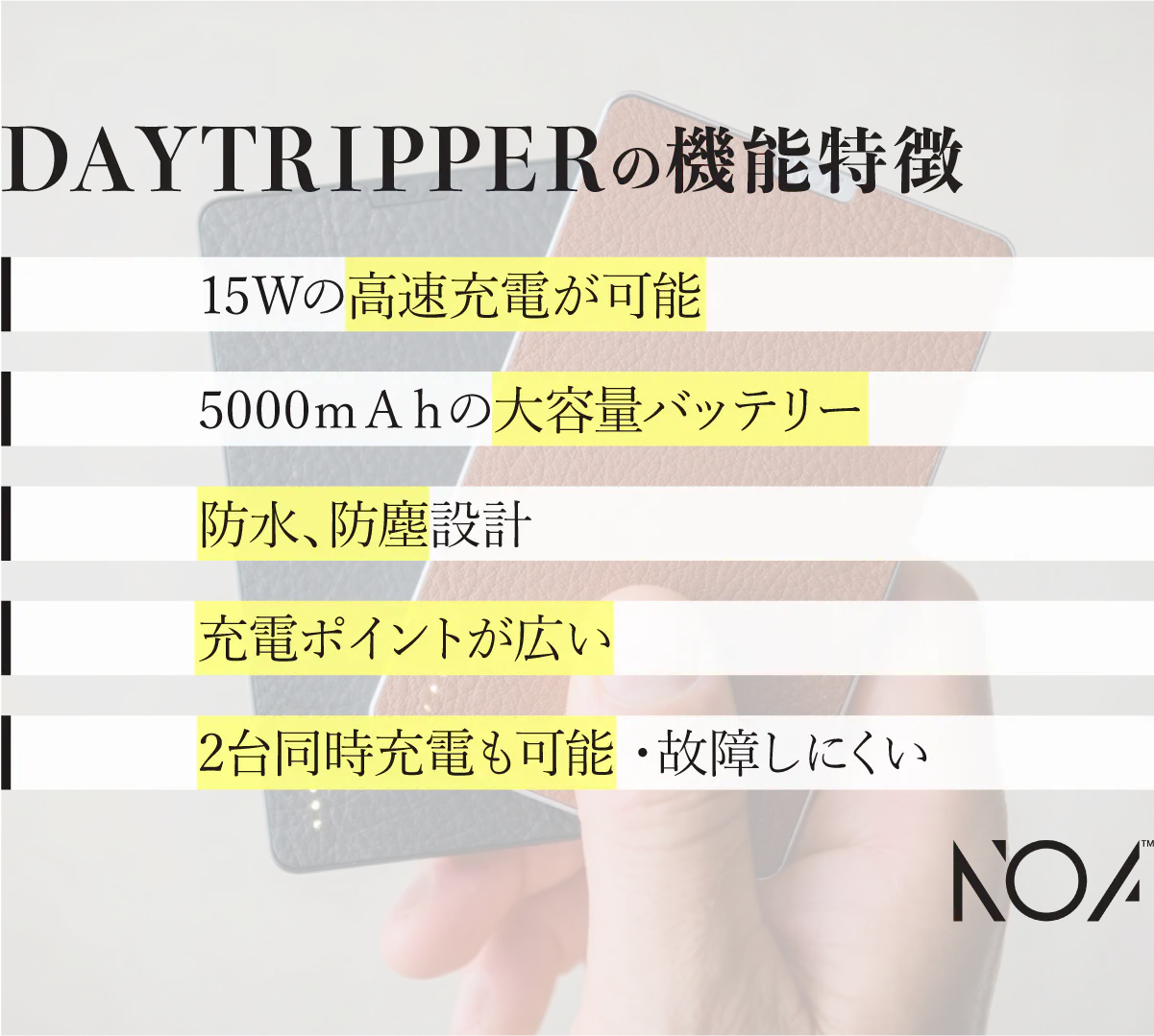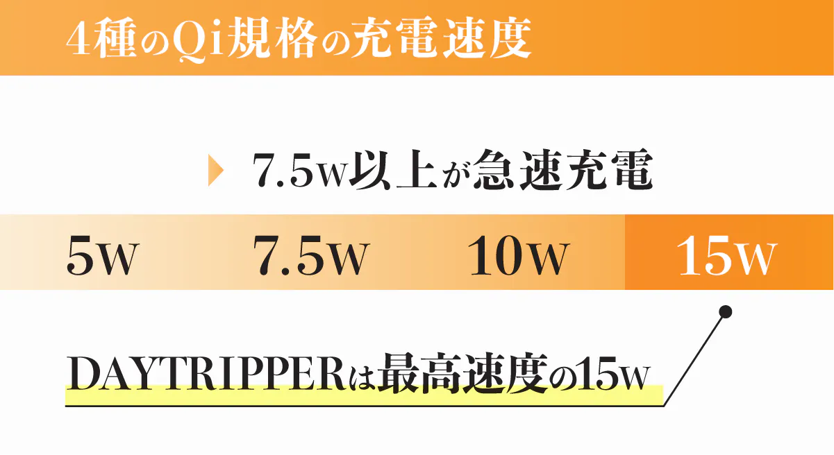 ほぼすべてのワイヤレス充電対応端末に使用可能な、ワイヤレス充電の国際規格[Qi]に対応しています。[Qi]は5W、7.5W、10W、15Wの4種類の充電速度に分かれますが、「DAYTRIPPER」は最高速度の15Wです。