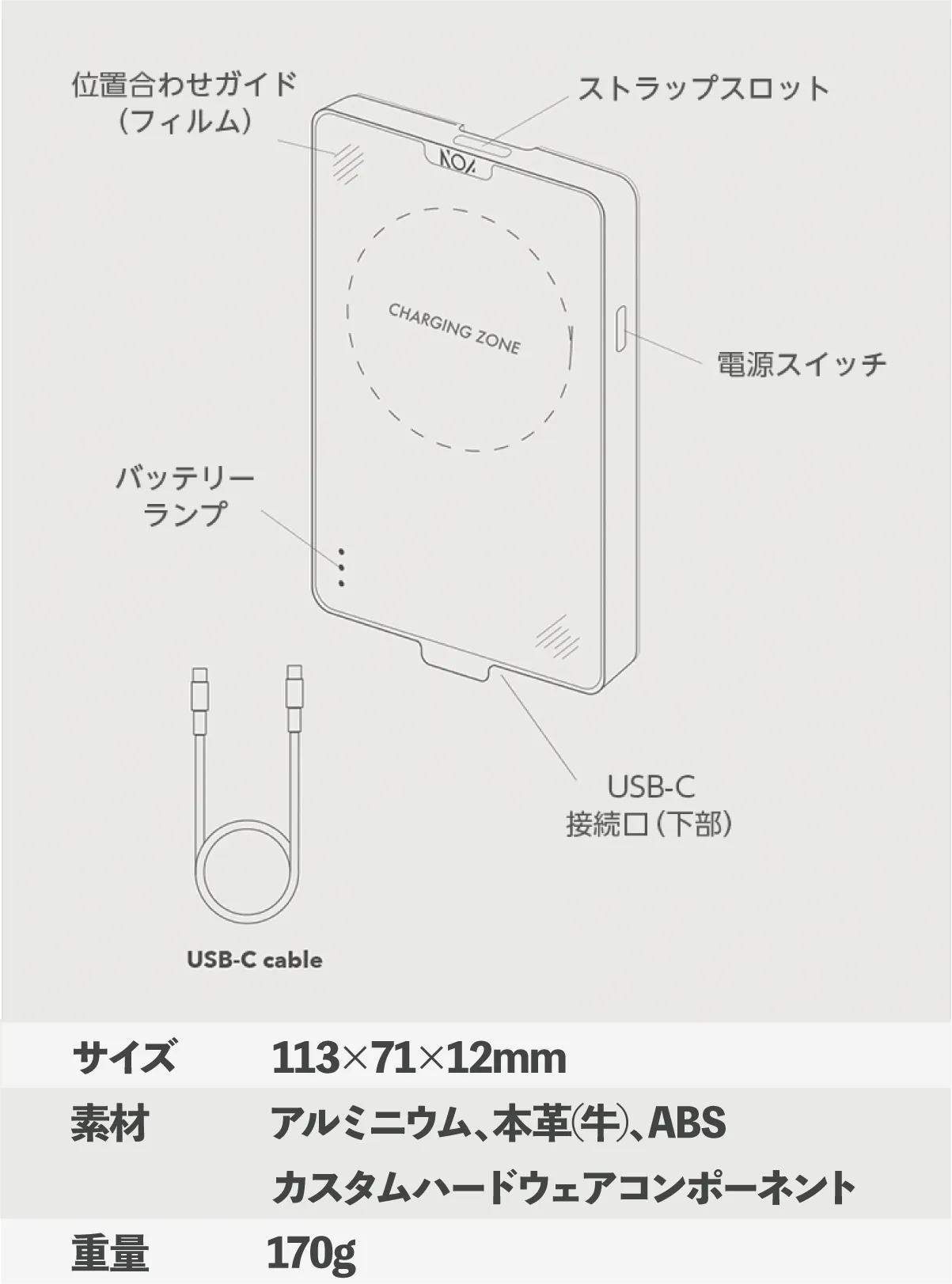 A.サイズは113mm × 71mm × 12mm - 170gです。手のひらに快適にフィットするように設計されており、充電しながら携帯電話を使用できます。