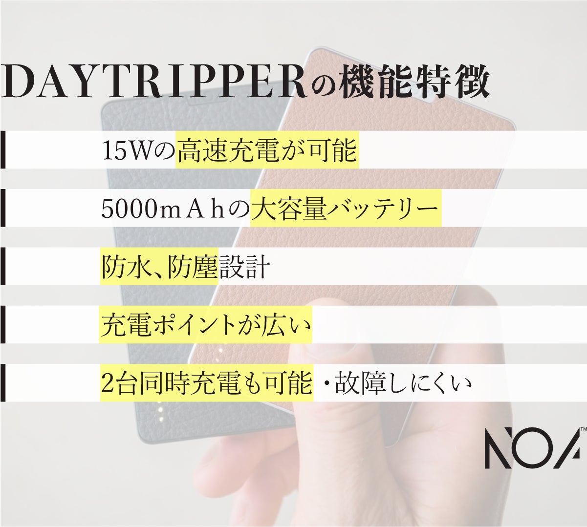 軽量ながら5000mAhの容量。1日使用するには十分すぎるといえます。 「DAYTRIPPER」のコンセプトはあなたの1日にお供してより素敵な時間とすること。バッテリー容量でストレスは与えません。