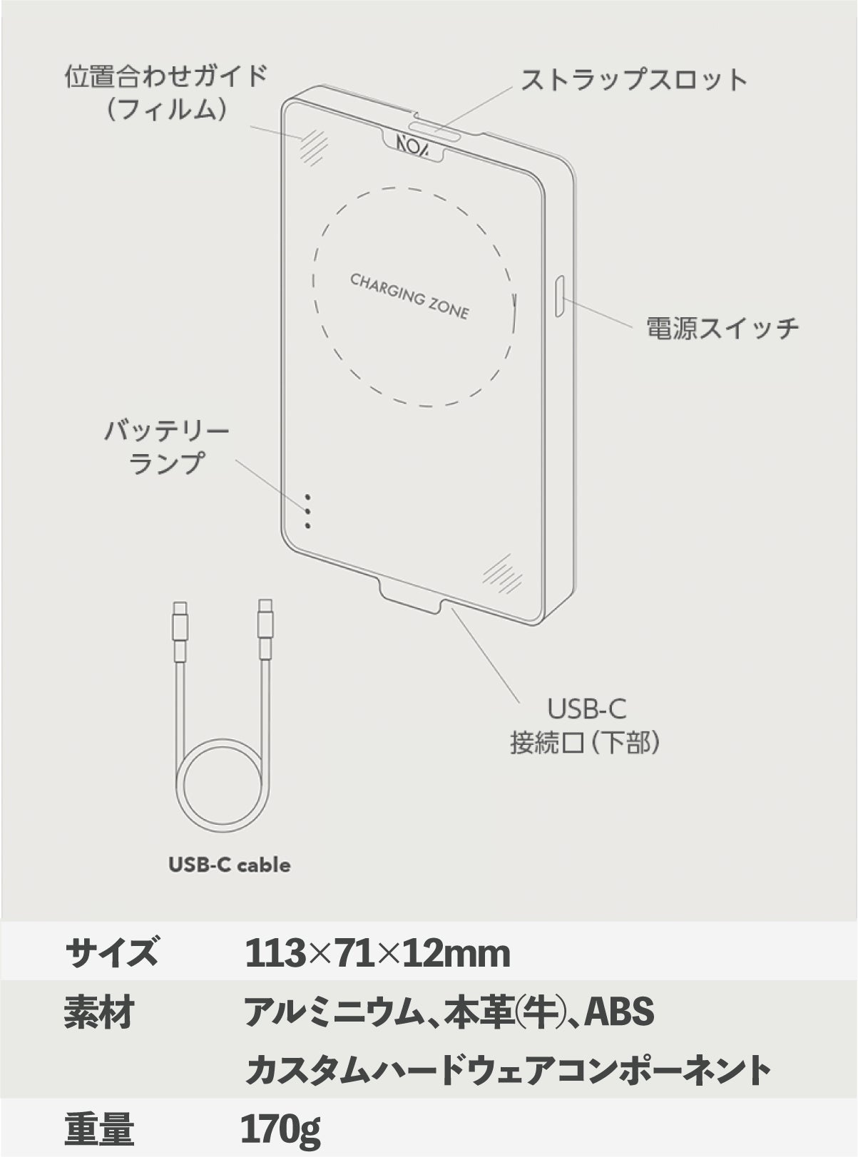 A.サイズは113mm × 71mm × 12mm - 170gです。手のひらに快適にフィットするように設計されており、充電しながら携帯電話を使用できます。