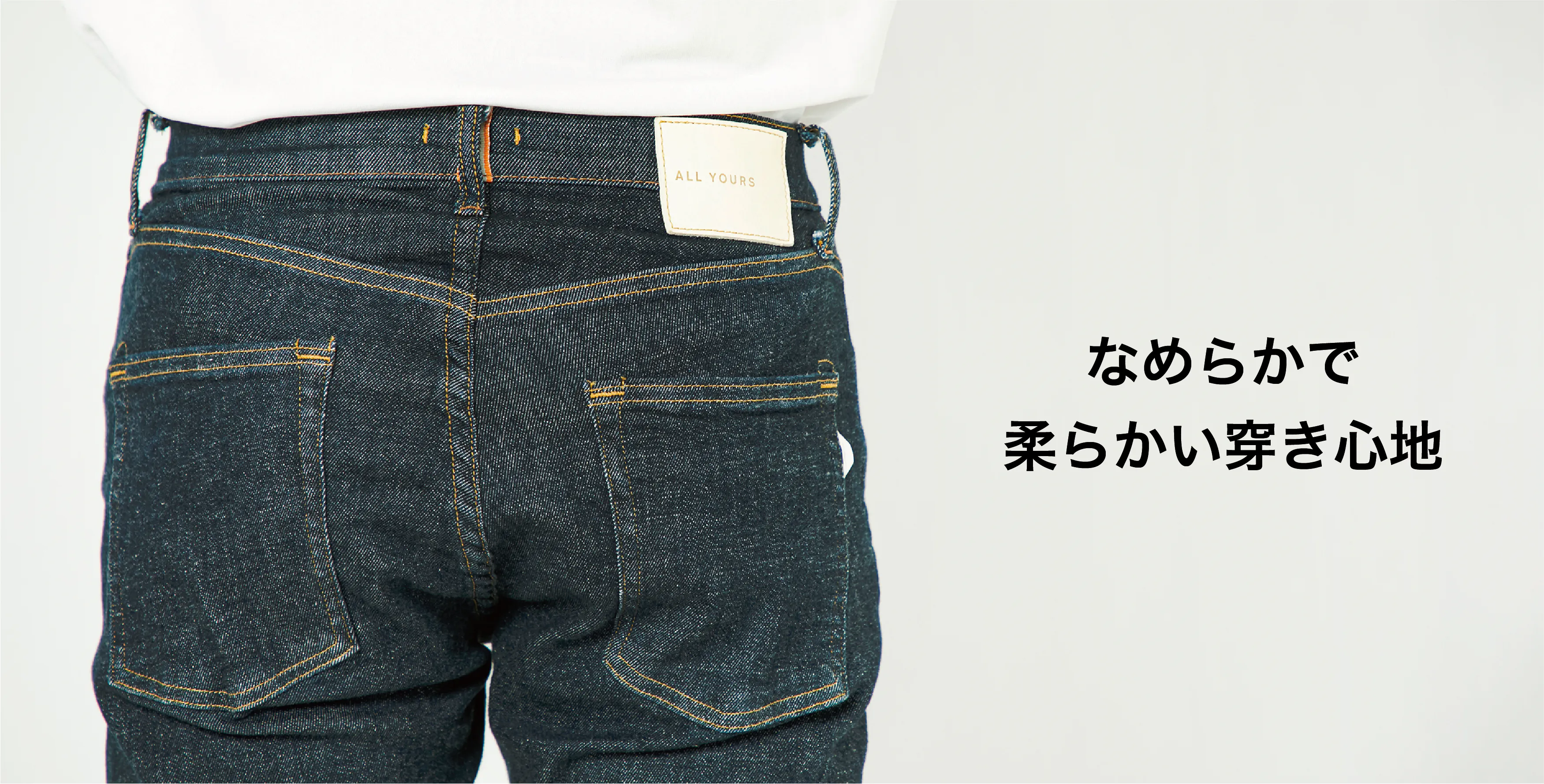 このジーンズの特長は、オーセンティックなジーンズな見た目とは裏腹の部屋着のような穿き心地にあります。