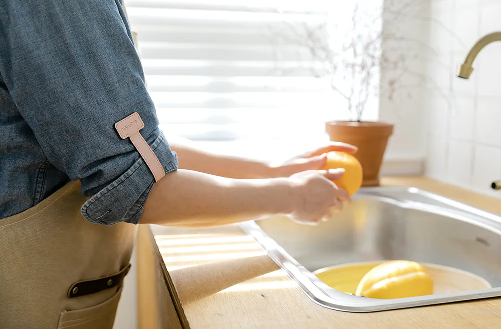 ヴィーガンレザーは水分が付着しても本革ほどシミになりにくく、さっと拭き取れば大きな負担が掛からないので、水回りの作業でも気軽にお使いになれます。