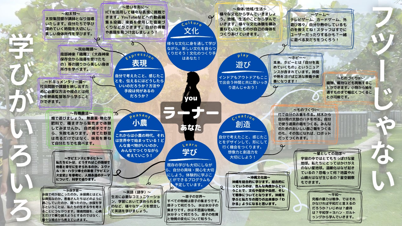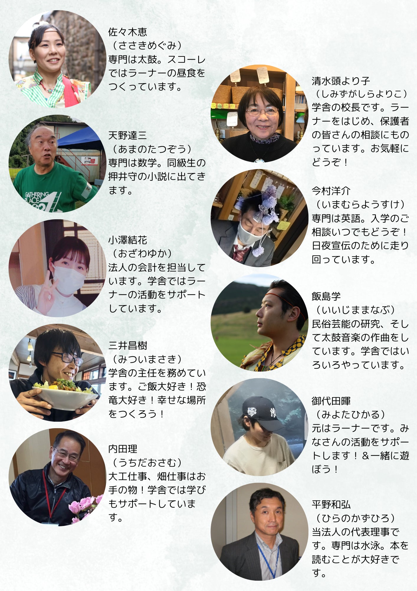 これまで、スコーレでは午前中に11時からの学び、午後に14時からの学びの時間をつくり、様々なことを学ぶ機会をつくっています。いろいろな物語を聞く、平和のこと、宇宙のこと、災害 のこと、言葉のこと、化学のこと、算数・数学のこと……。また、ほぼ毎月様々な行事をラーナー中心に計画し、実施してきました。5月は上野の国立科学 博物館へ恐竜展を見に行き、6月は北本の自然観察公園に行き、7月は深谷のプールパティオへ行 きました。8月は中津川へ1泊のキャンプ、10月はスコーレフェス(文化祭)を行いました。そ のほかにも、タケノコ掘り、流し素麺、ハロウィンパーティー、クリスマスパーティ、餅つきも行 っています。スコーレに隣接する畑で、種まきをしたり、ジャガイモやサツマイモを掘ったり、いろいろな作物を収穫したりもしてきました。 スコーレは、荒川土手に近いので、土手まで散歩したり、土手滑りをしたり、アクティブな時間も過ごしています。