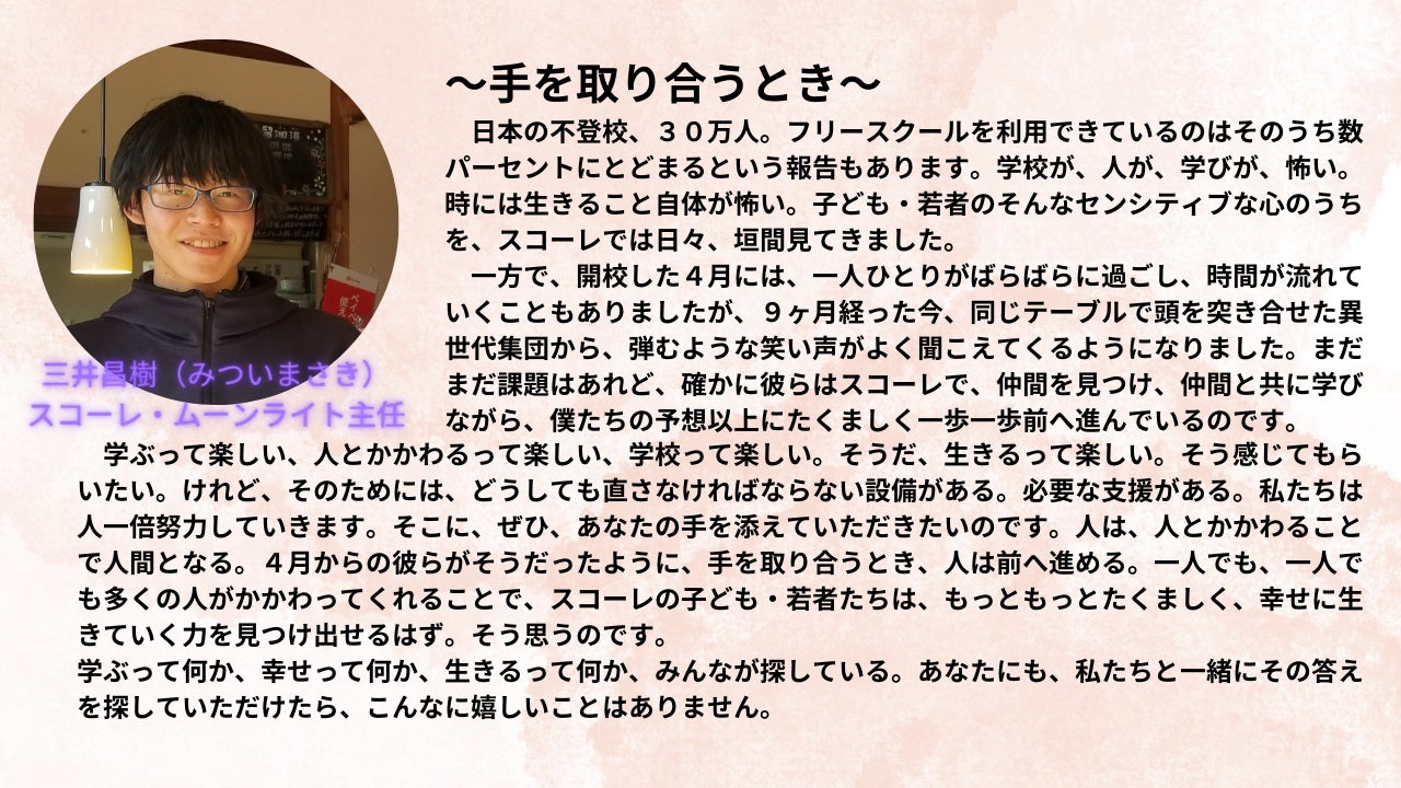 ■2023年フリースクール、スコーレ・ムーンライト開校。現在に至る。