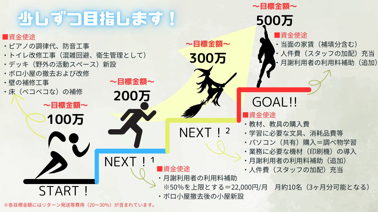 最初は100万円を目指し、最終的には500万を目指します。目標金額と資金使途は以下のように考えています。