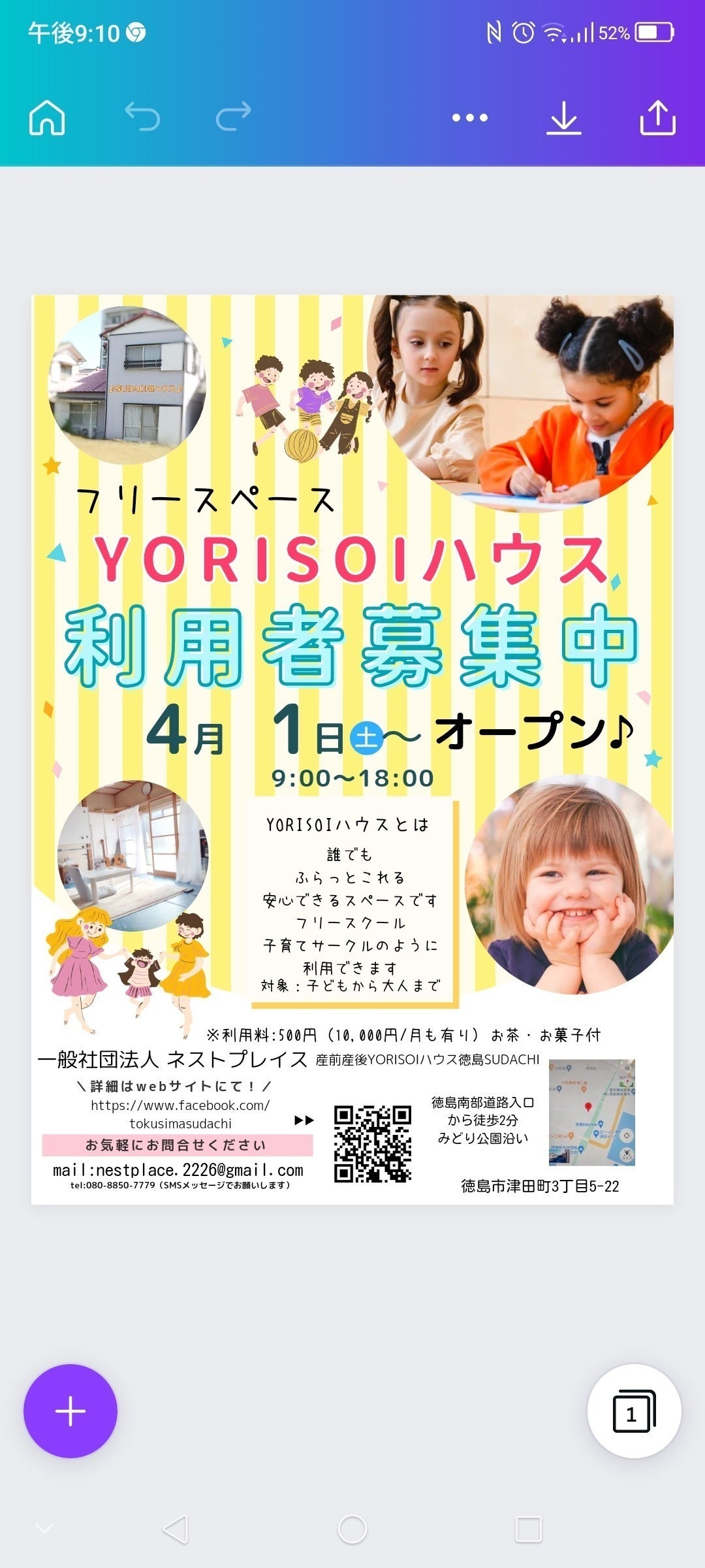 一般社団法人ネストプレイス〜産前産後YORISOIハウス徳島SUDACHI〜です。