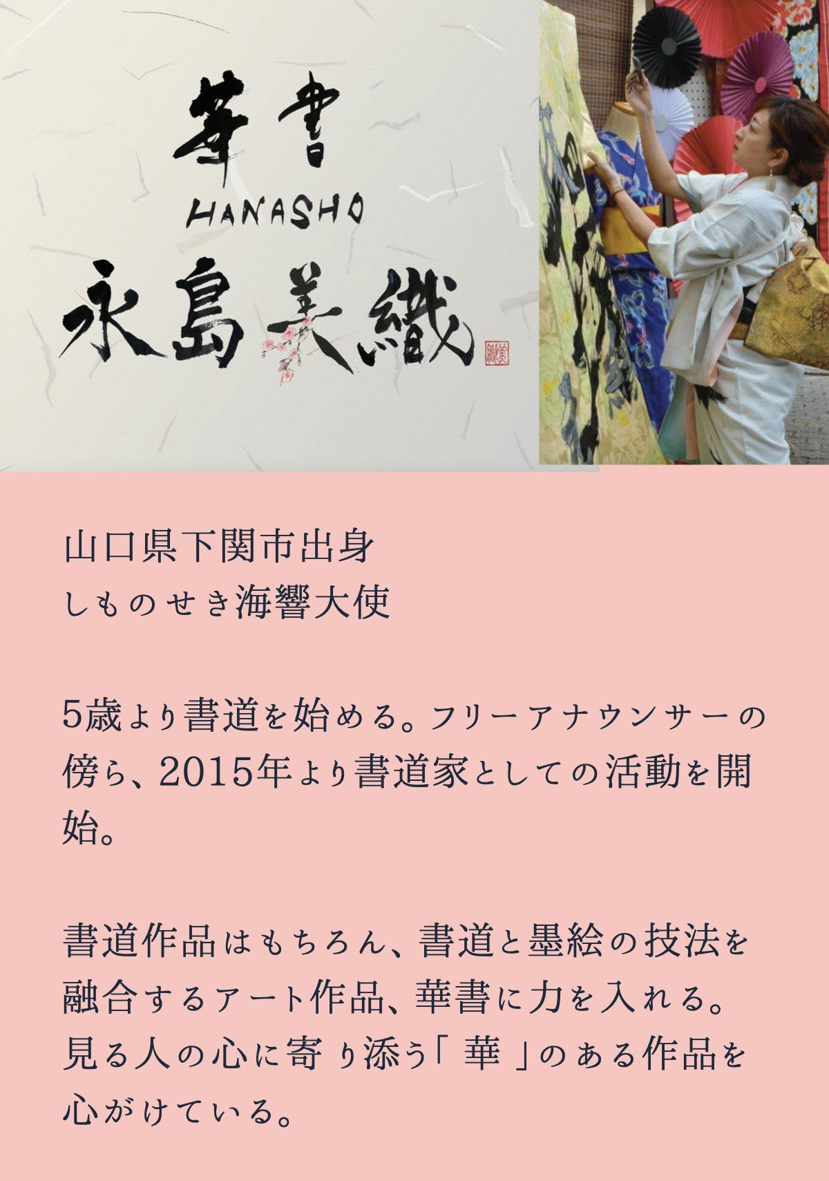 はじめまして。「華書(はなしょ)®」というオリジナルの書と墨絵を融合したアートを書く書道家として活動している永島美織と申します。数あるプロジェクトの中からご覧いただきありがとうございます。