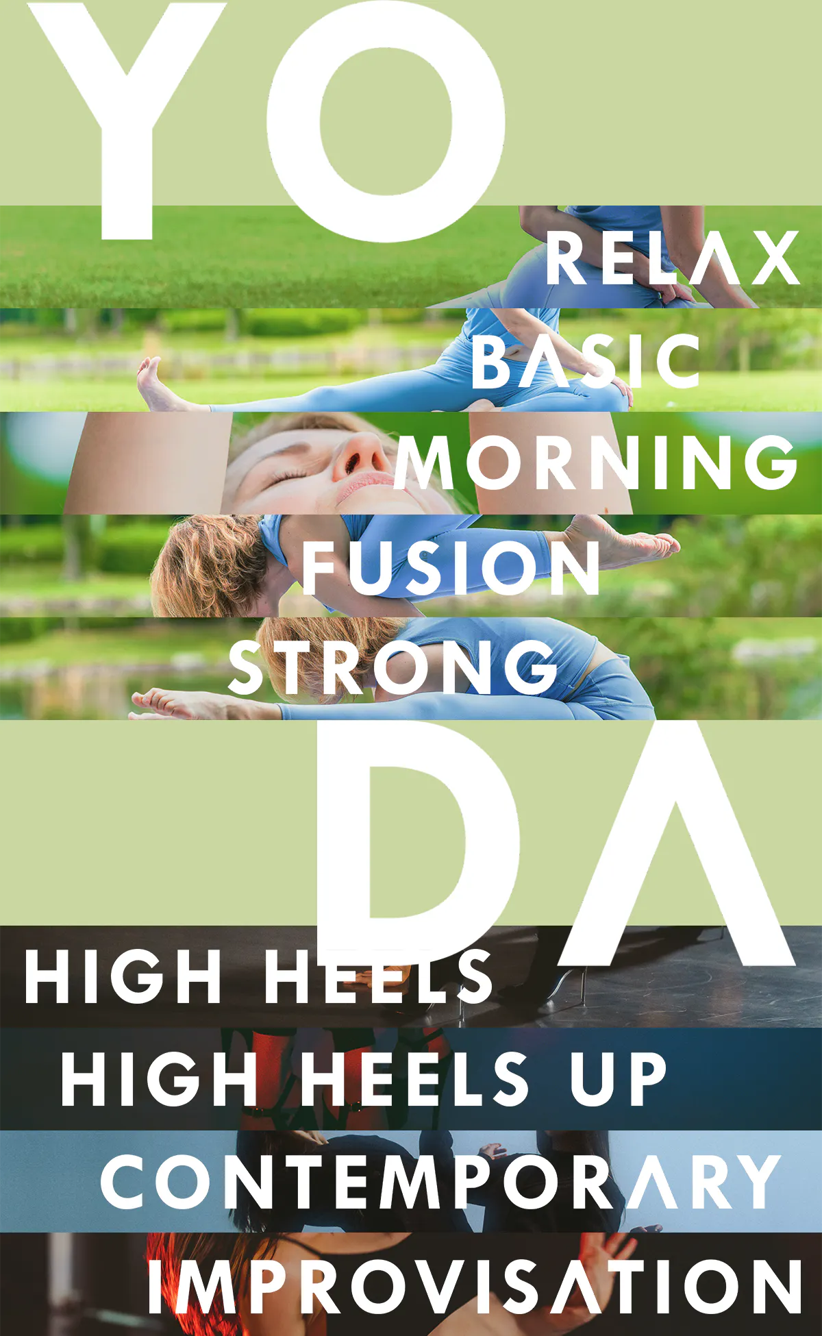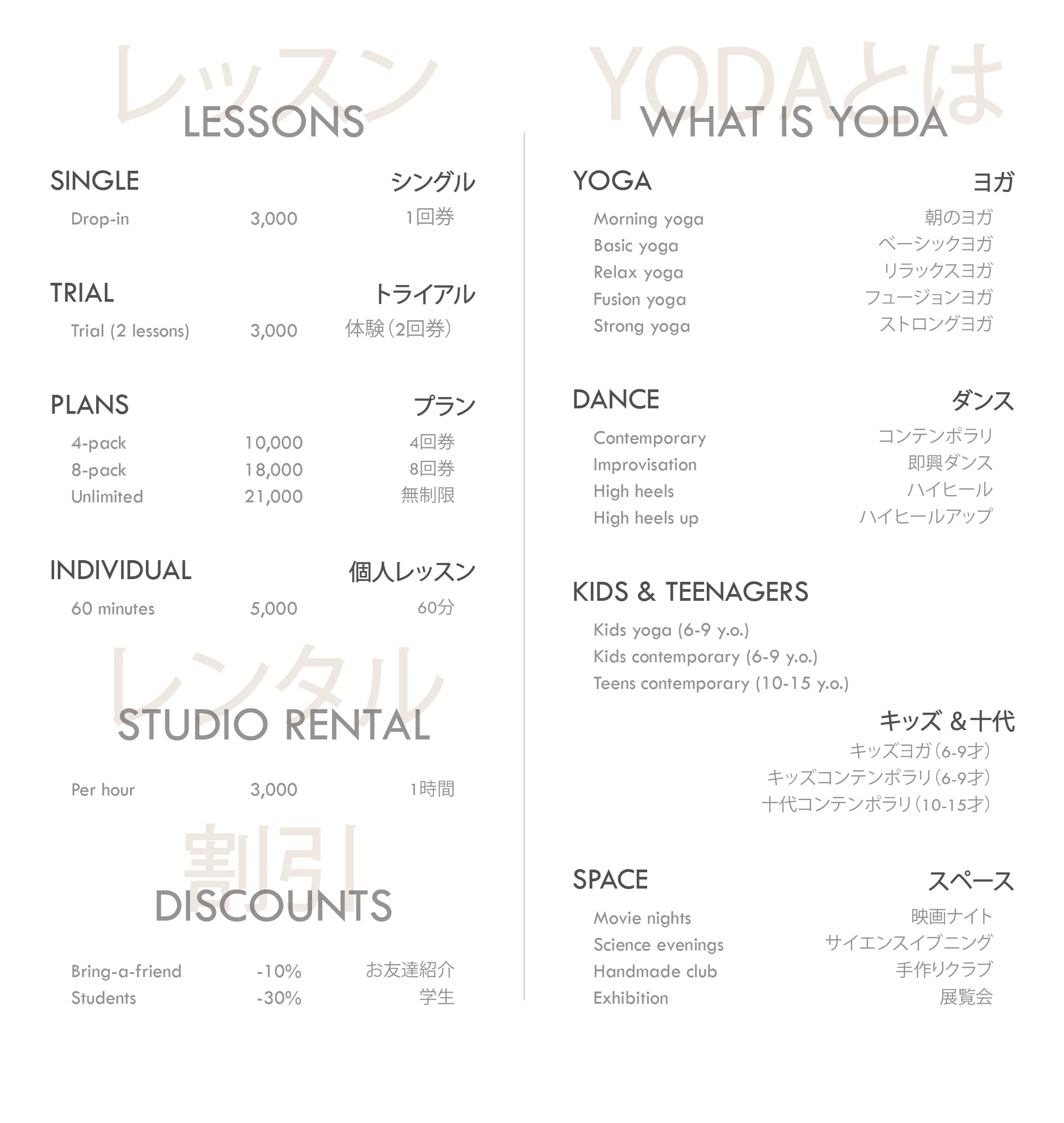 First of all, our activity focuses on yoga and dance. We provide 75-minute-long group lessons. We have a drop-in (single), a combo trial (pay-one-attend-two) options, and three plans for regular participants. You can attend any studio lesson, whether yoga or dance, with every plan. Learn more about our lessons on our page: www.yodastudio.jp.