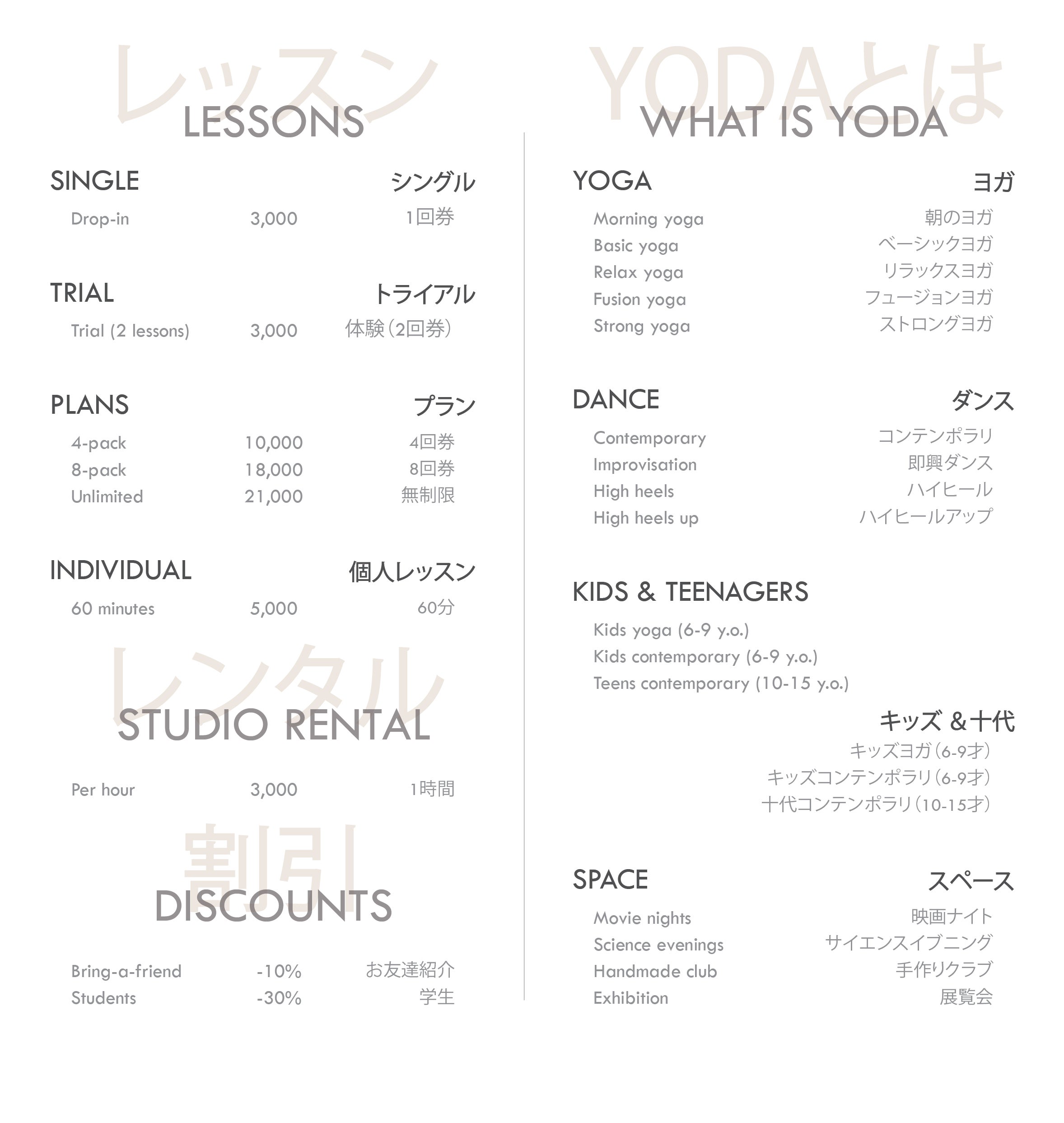 First of all, our activity focuses on yoga and dance. We provide 75-minute-long group lessons. We have a drop-in (single), a combo trial (pay-one-attend-two) options, and three plans for regular participants. You can attend any studio lesson, whether yoga or dance, with every plan. Learn more about our lessons on our page: www.yodastudio.jp.