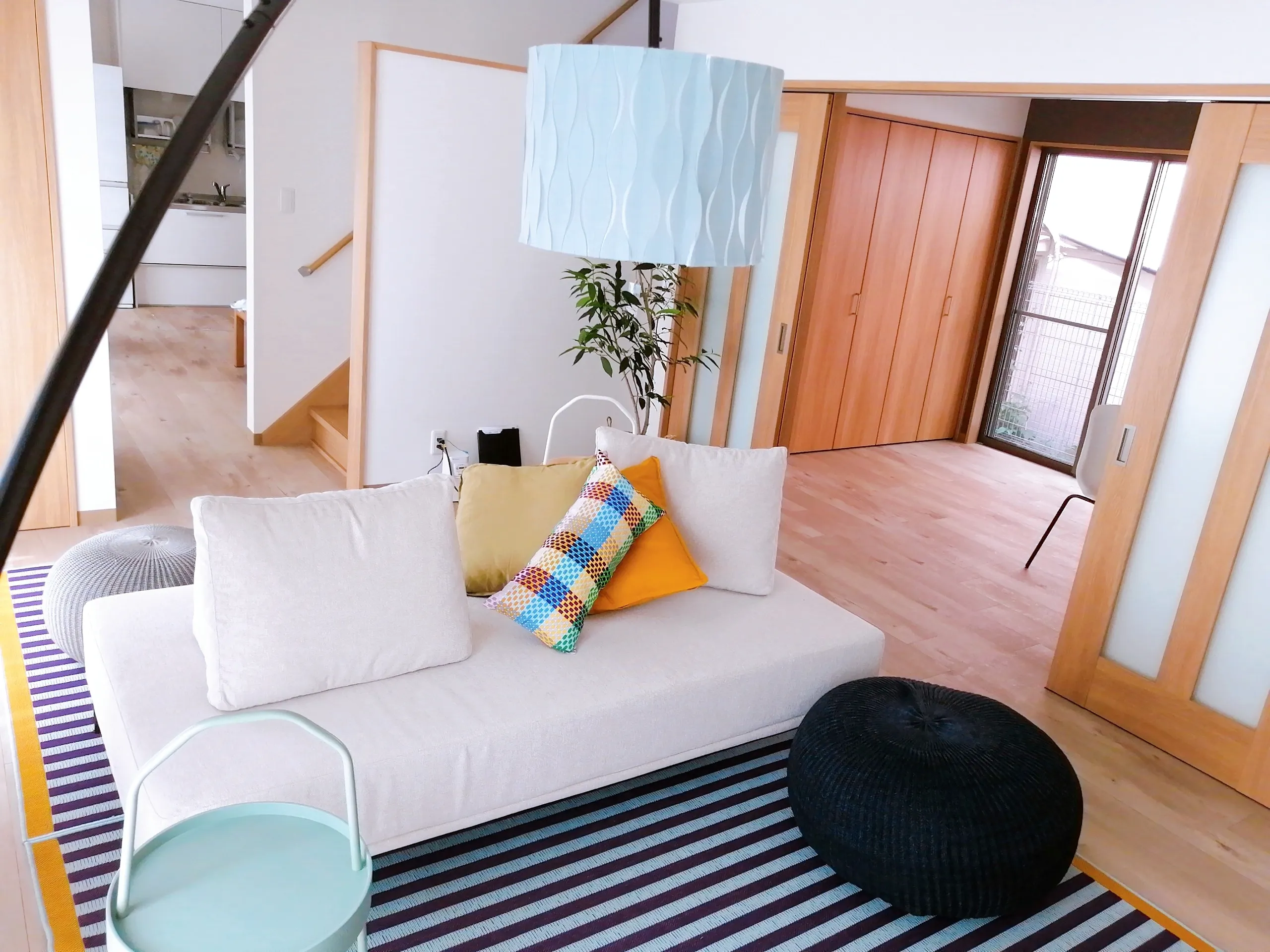 待ちに待ったソファーが届きました。自由に背もたれが変えられて、子ども達が好きな場所に座ることができます。そして、なんとベッドにもなります。これでリビングが完成です!
