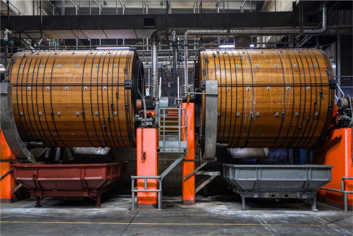 ミリング加工とは、革の線維をほぐし柔らかくする特別な加工の一つです。革を巨大な樽状の回転器の中に入れ、長時間かけて揉みほぐします。