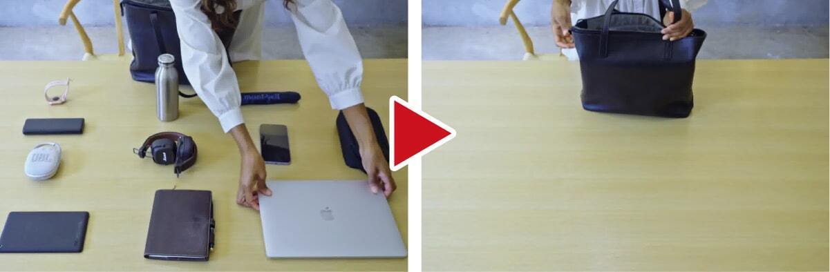 トートバッグの弱点である「中身が見える問題」を解決すべく、天面フラップを搭載。安心して使えるトートバッグです。