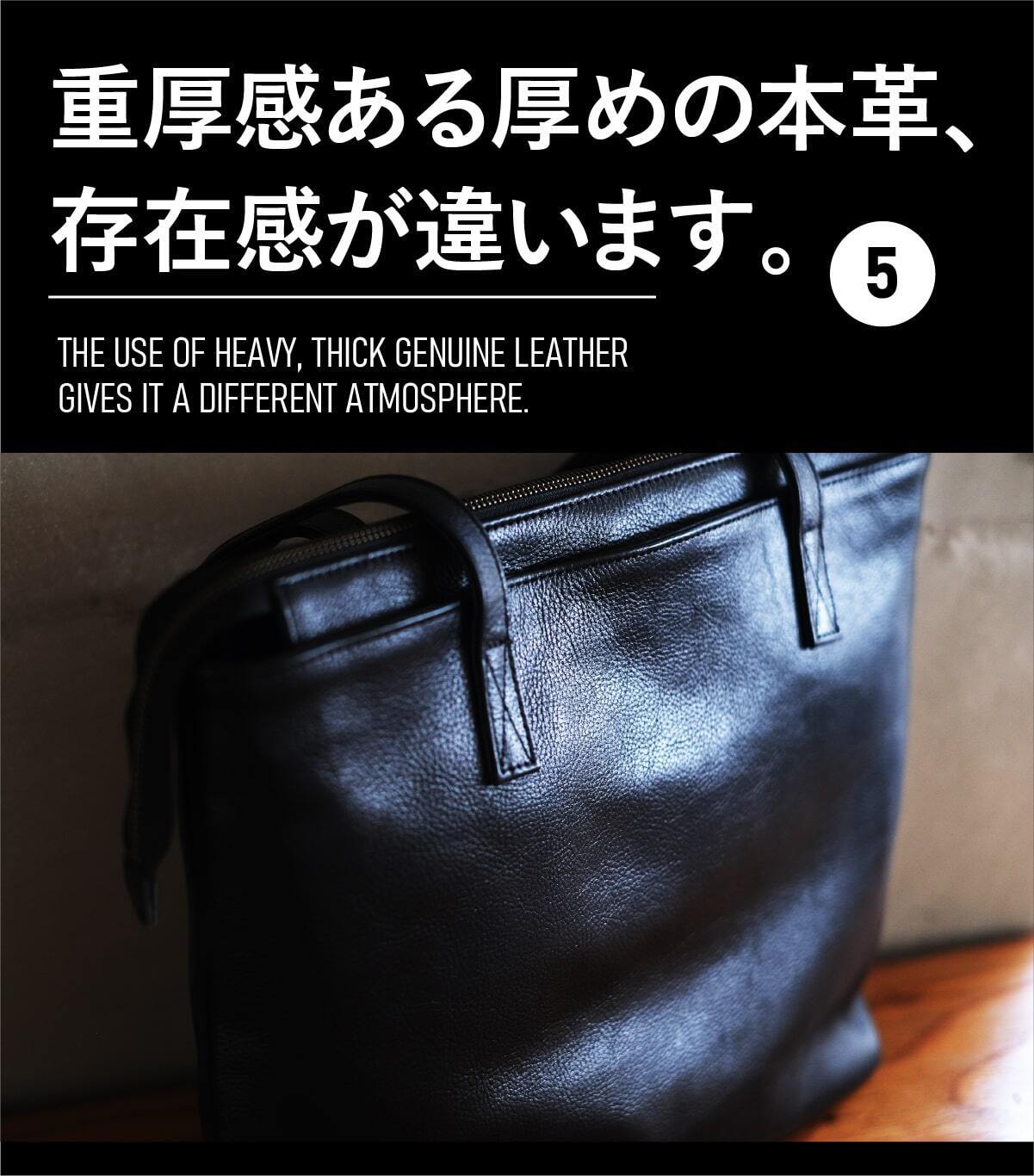 高級感あふれる見た目からは想像できないほどの軽さを実現。重たい本革トートバッグはもう過去のもの。新時代の本革トートは見た目の重厚感と軽さを兼ね備えたギャップ感あふれるプロダクト。