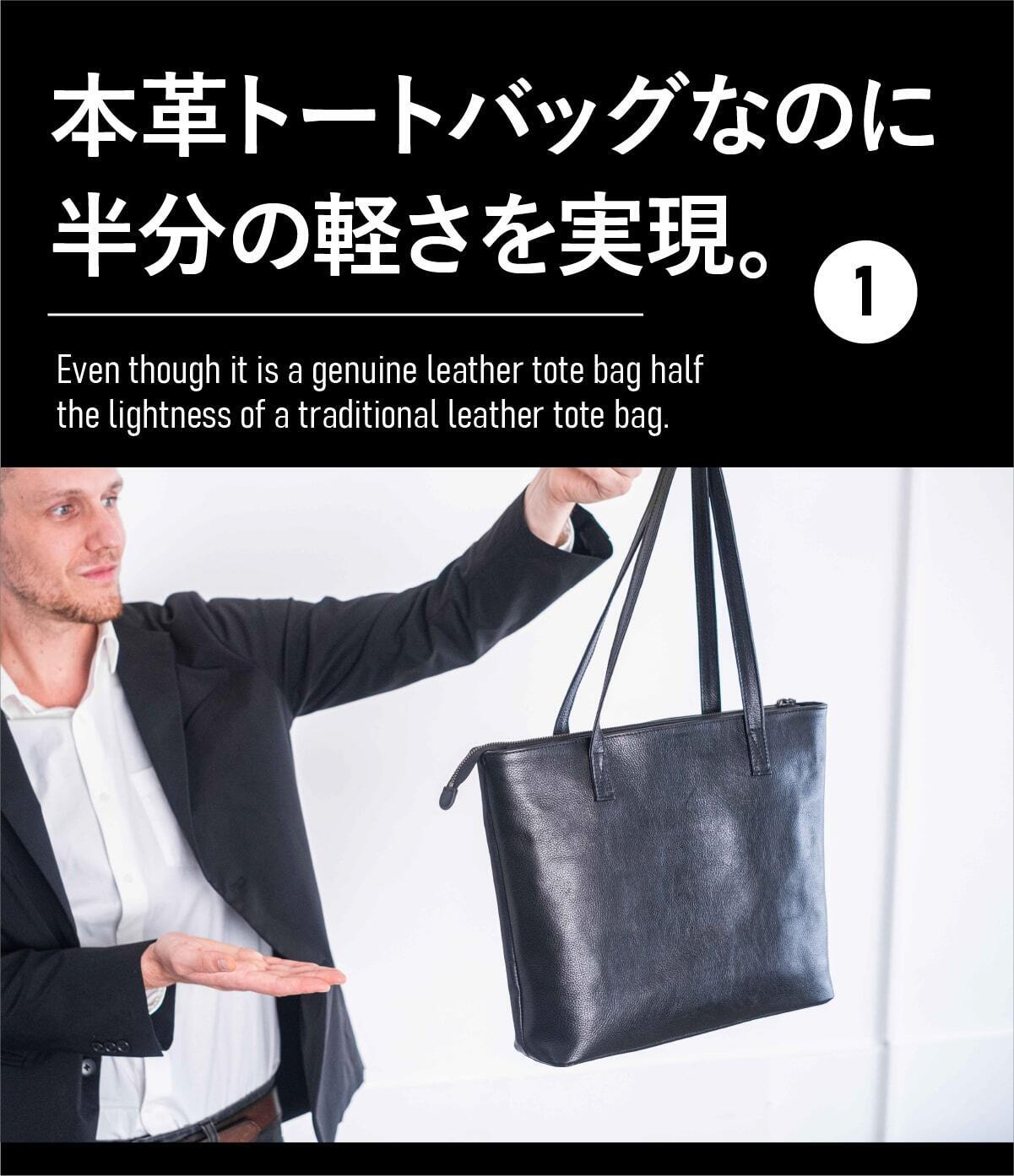 高級感あふれる見た目からは想像できないほどの軽さを実現。重たい本革トートバッグはもう過去のもの。新時代の本革トートは見た目の重厚感と軽さを兼ね備えたギャップ感あふれるプロダクト。