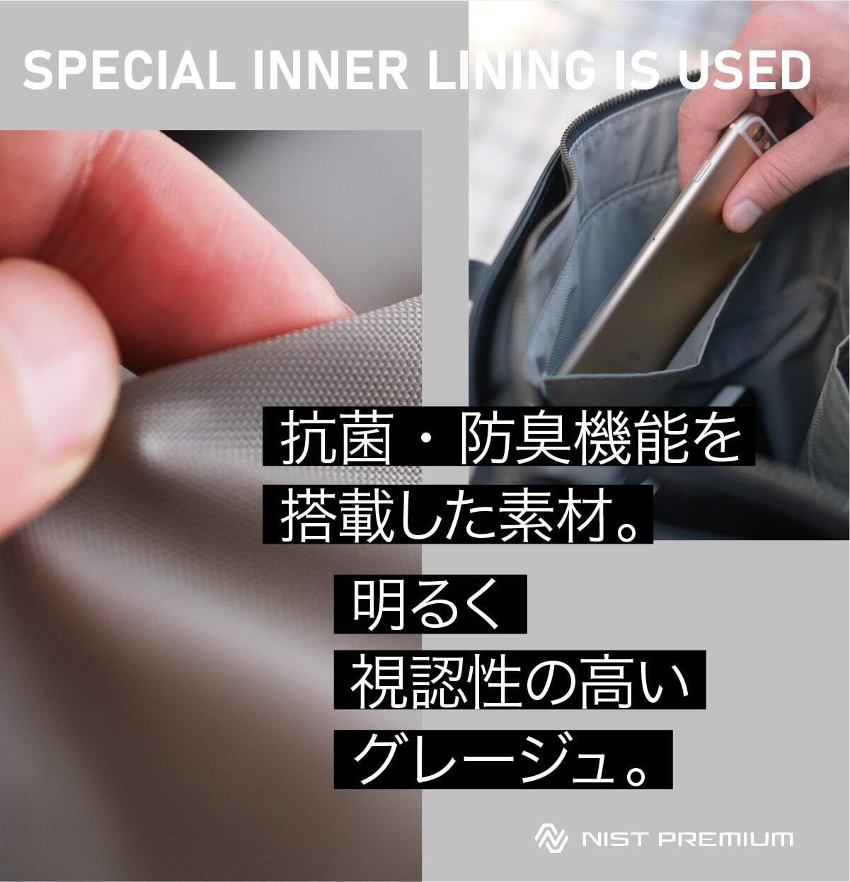内側は明るく見やすいグレージュのインナーを採用。素材にクリンベレNY(抗菌・防臭裏地)を採用しました。抗菌加工した素材で、臭いの基となる菌を抑制することが出来ます。