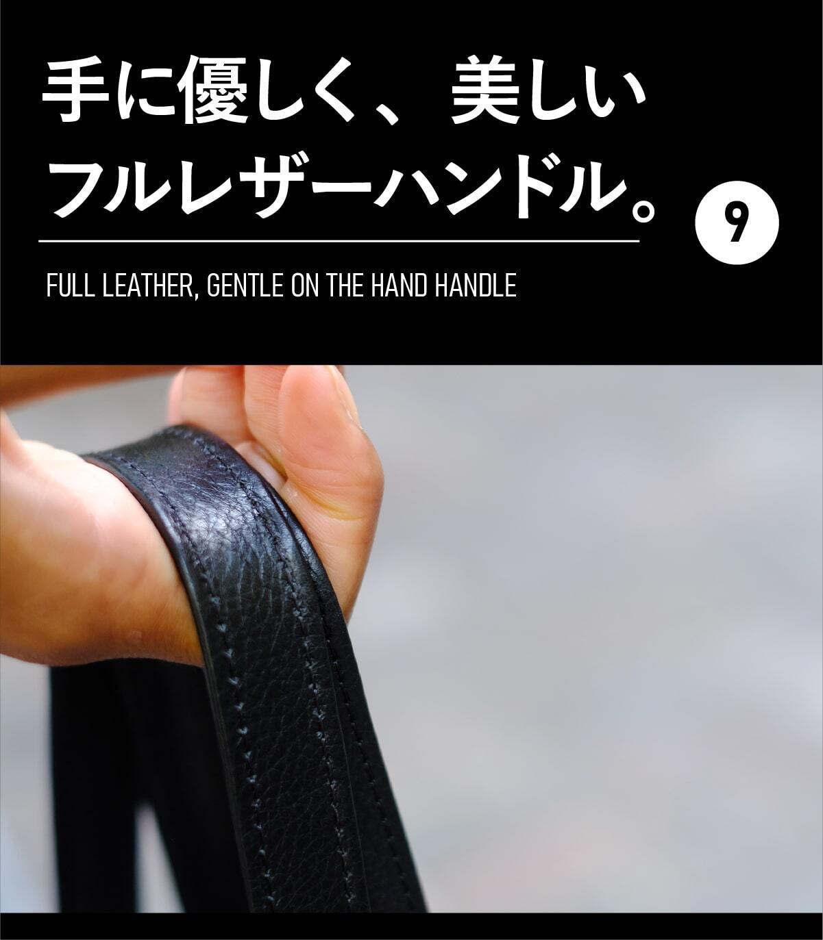 ハンドルは手にフィットするフルレザーの約2.0cm幅を採用。細いハンドルは長時間持つのが辛いため約2.0cm幅で仕上げました。