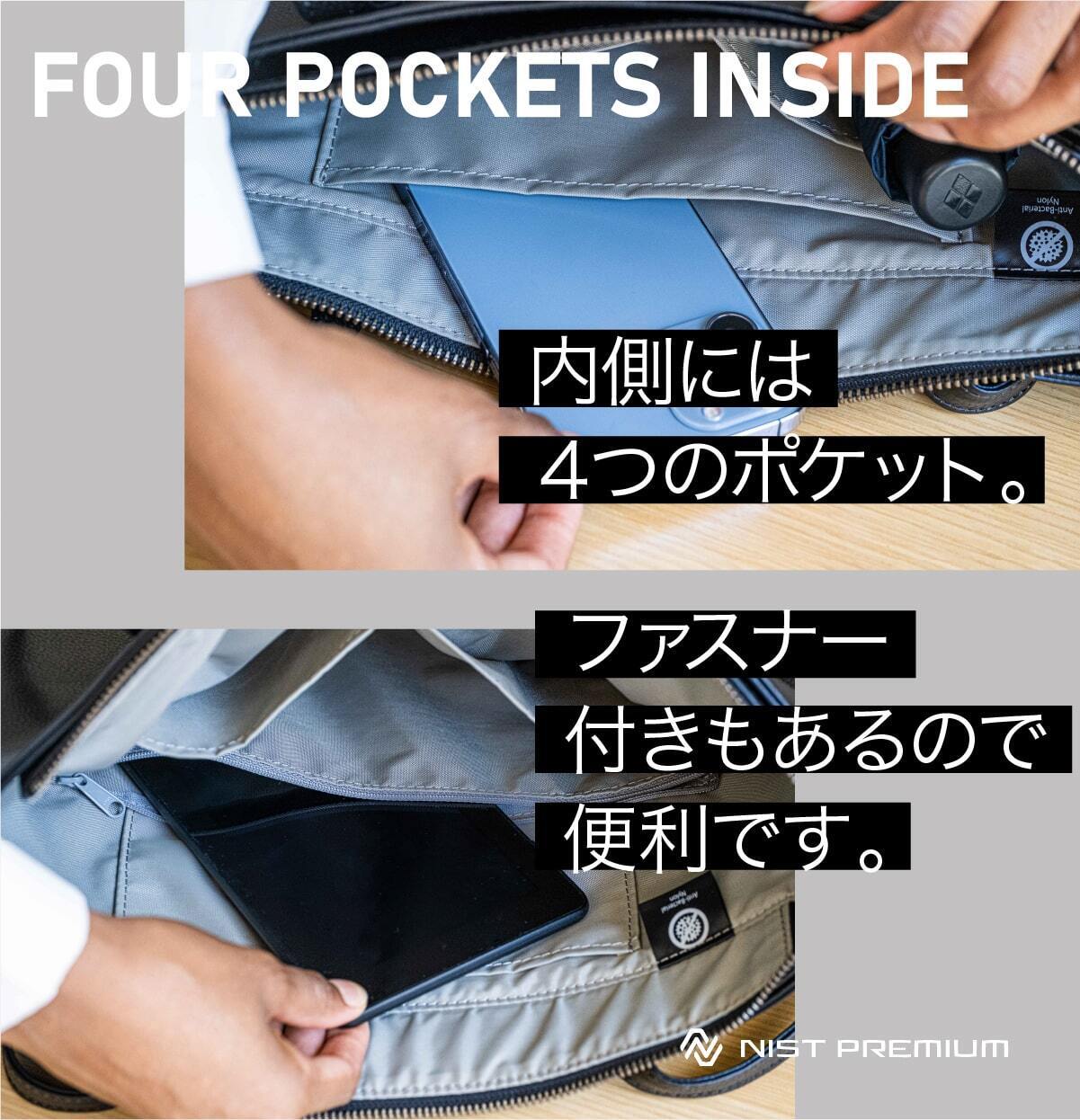 必要最低限の仕分けに便利なオープンポケットを3つ用意しています。ファスナー付きポケットも1つ付いているので、大切なものを収納しておくのにも便利です。