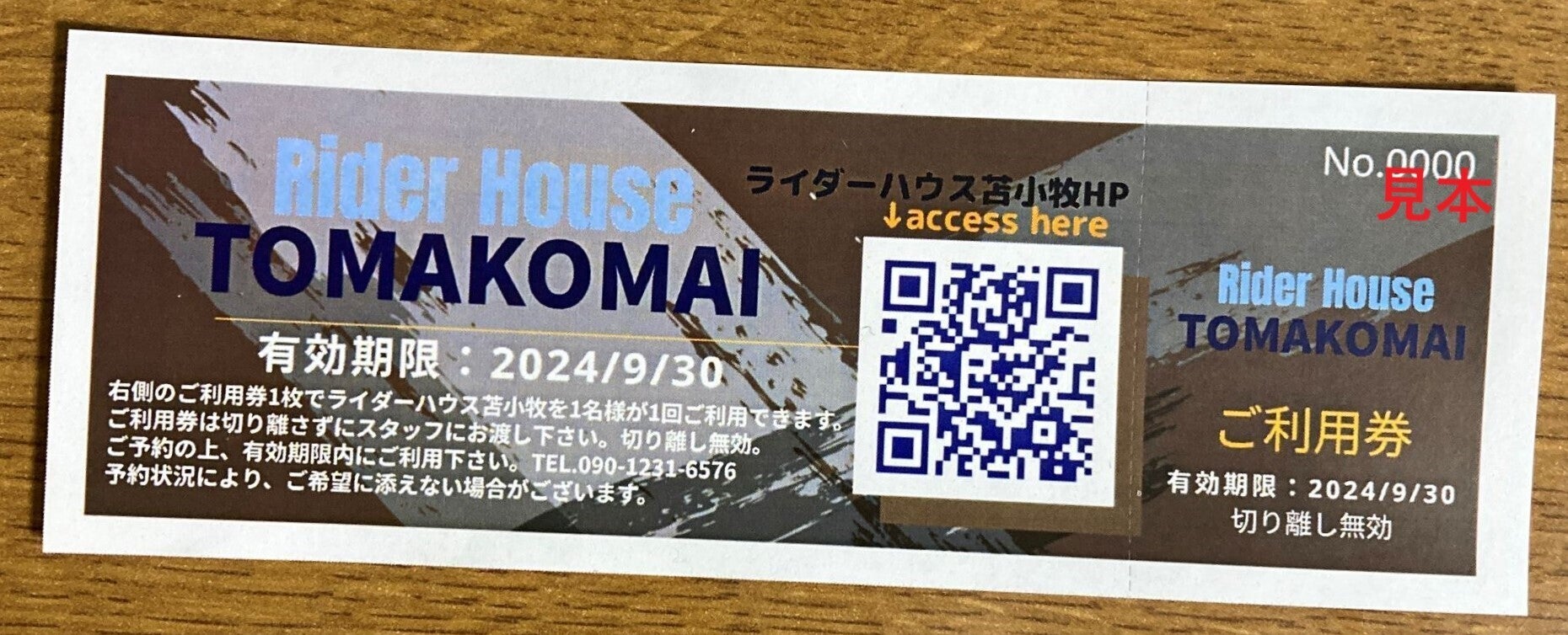 ・ライダーハウス苫小牧の利用券(有効期限:2024年9月30日)
